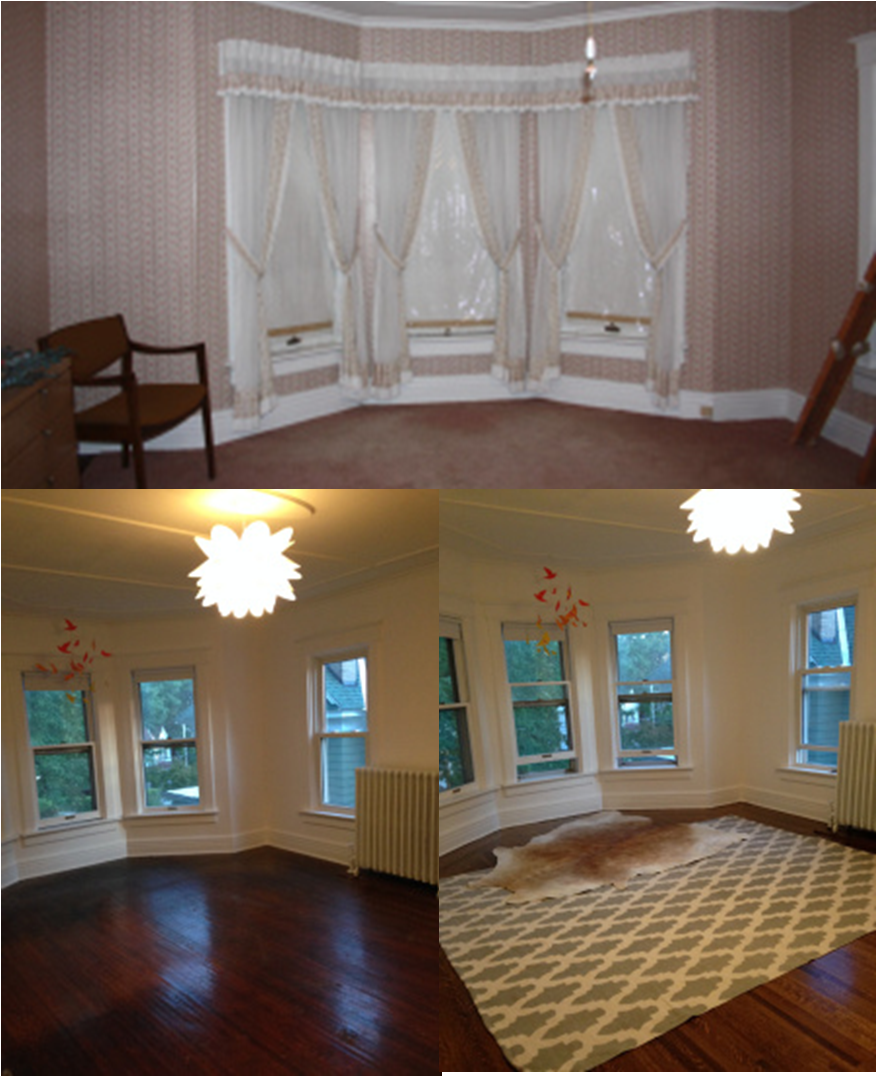 Little did I know how tedious it is to remove wall to wall carpeting! Especially when it is as heavy as this one was. We tackled it room by room, ripping the carpet away from the carpet tack strips along the edges, cutting it into manageable sections with a retractable blade knife, rolling up the carpet sections, then rolling up the carpet pad sections underneath (in some places, the carpet pad was completely disintegrated and we actually had to sweep up carpet pad dust and chunks), and then going after all the tack strips and larger carpet nails that were everywhere. And then it was time to tie up the carpet and lug it to the garbage, bag up all the debris while being careful not to impale yourself with tack strips (hate those things!), and attempt to clean the residual gunk off the floors. Just writing that makes me exhausted and slightly nauseous!