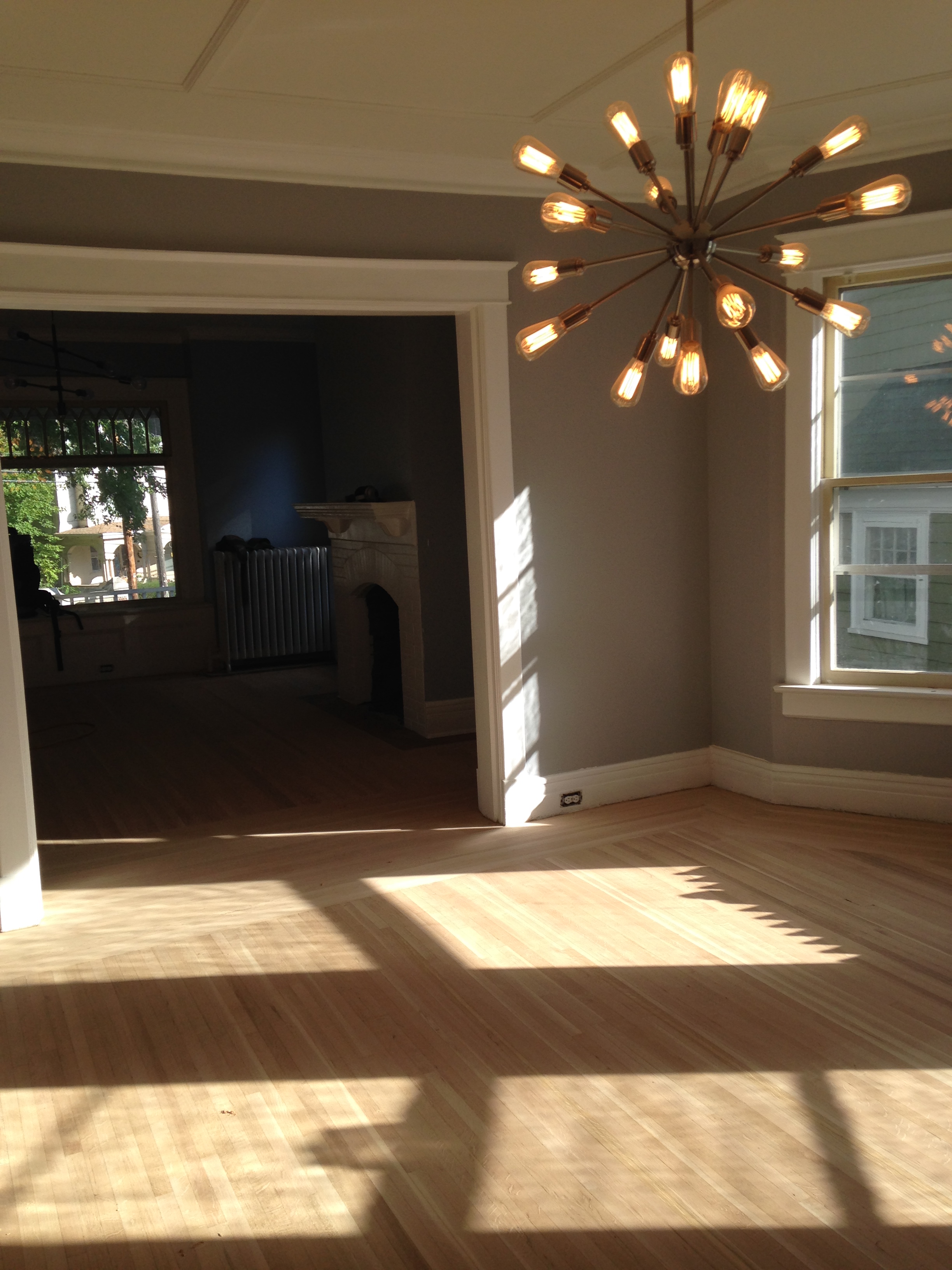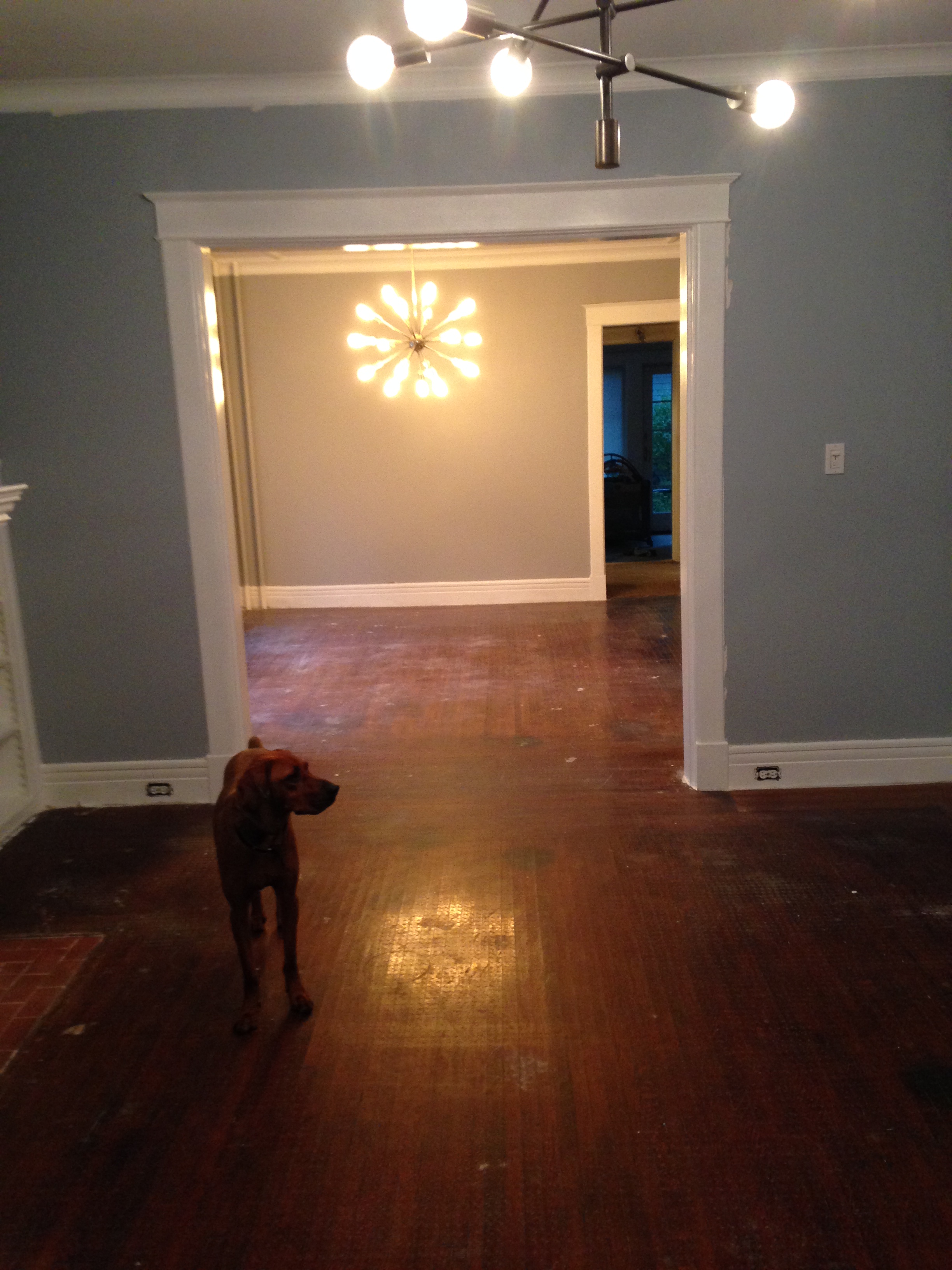 We finally finished removing all the shag carpet from our living room, dining room, foyer, both staircases, and upstairs hallway, in addition to an unfortunate mauve carpet in G’s room, by May of last year. That’s five solid months of carpet removal, but I was pregnant, so things were pretty slow around here. After the floors were uncovered but before we refinished them, we had a lot of work done to our walls (a lot of the cracked plaster was covered up with 1/4 inch drywall because skim coating the entire house was just not feasible), had ceiling lights installed, and painted all the walls. Again, exhausted just typing that.