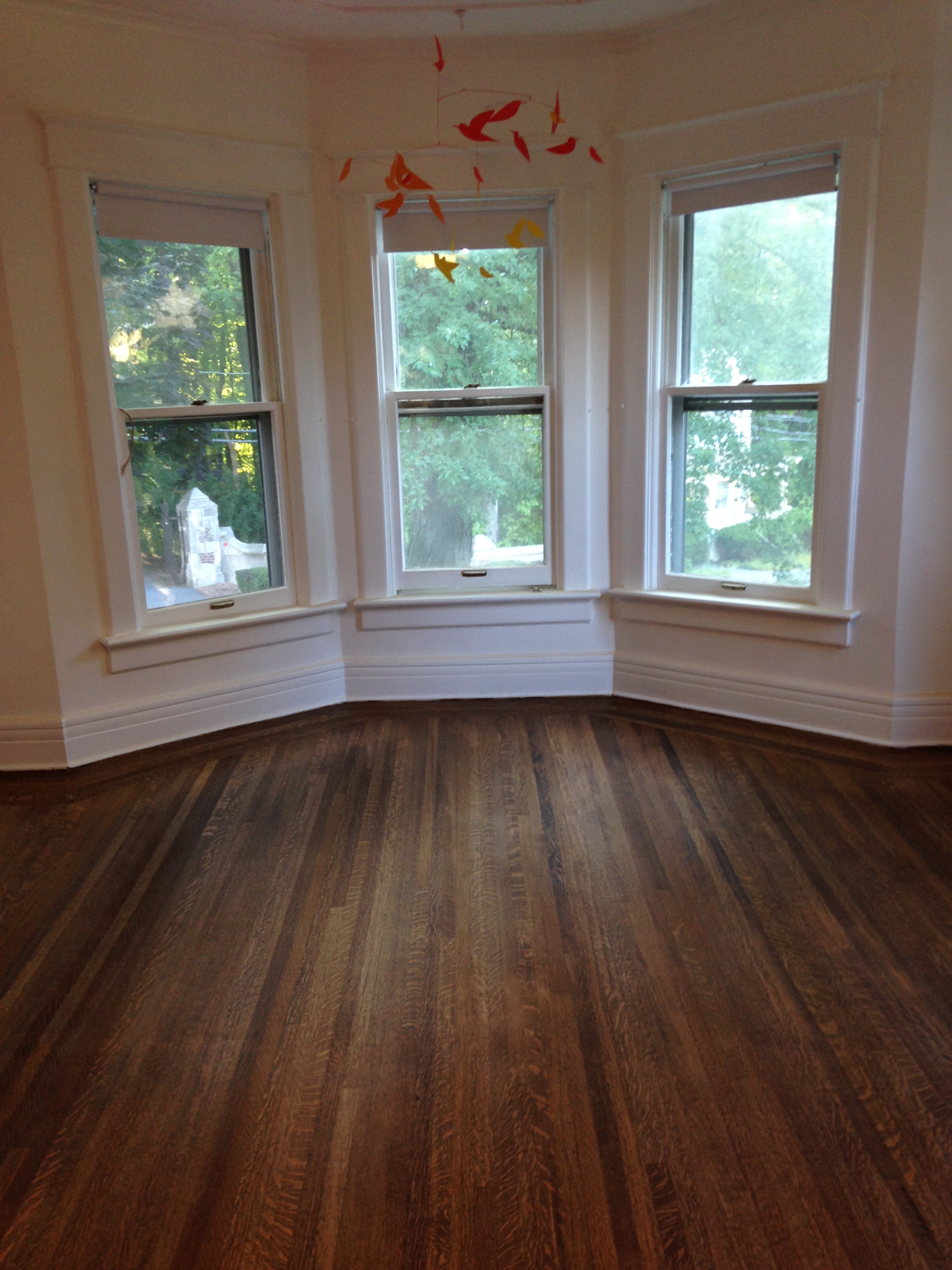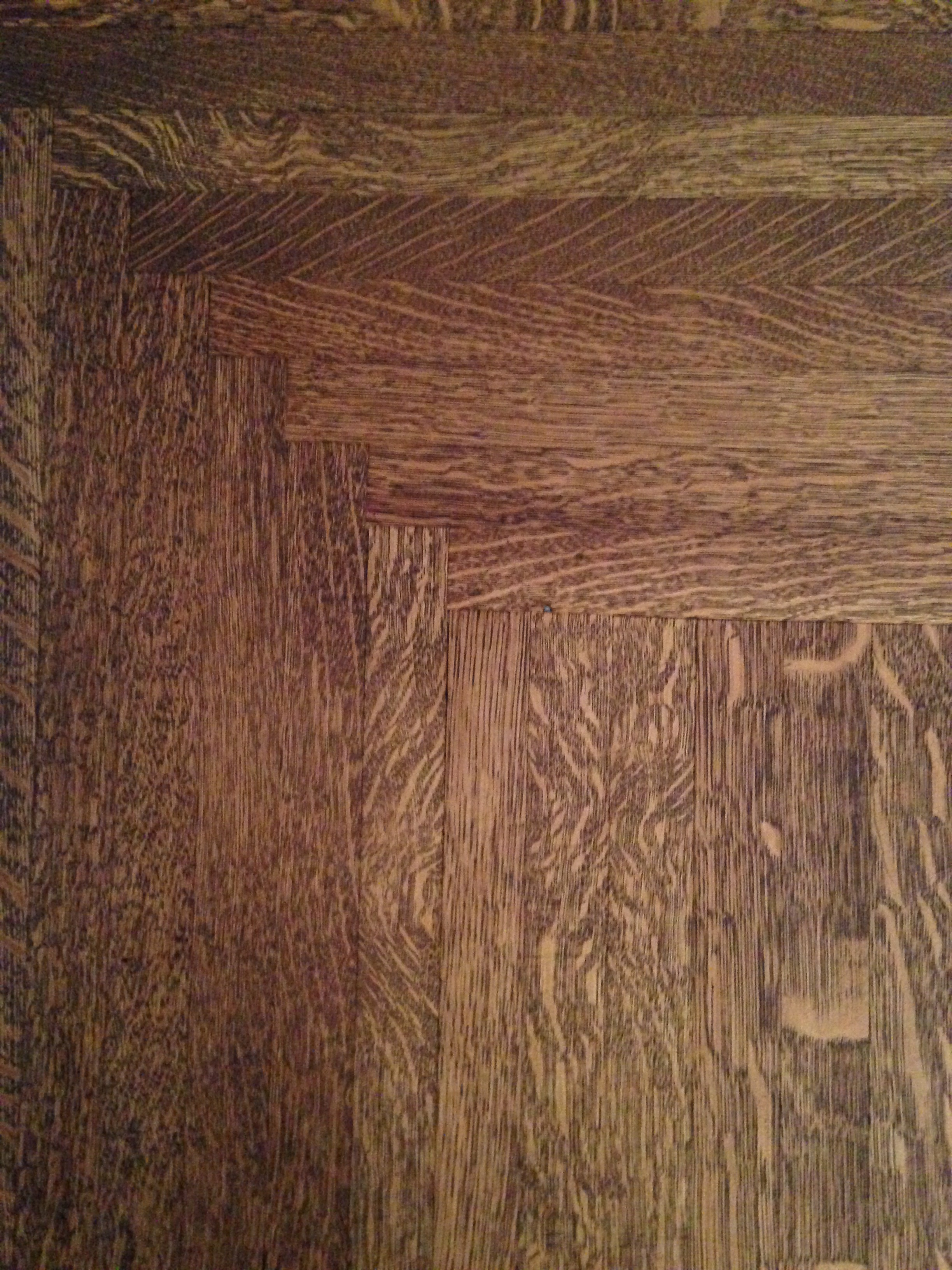 It was all worth it when we found gorgeous quarter-sawn oak flooring with thin two-inch boards in every room! Each space has a gorgeous border running parallel to the walls with the boards in the middle running the length of the room. Unfortunately, the floors had been covered up for decades, and the carpet had left a strange pattern of indentations in the thick, dark finish that had originally been put on the floors.