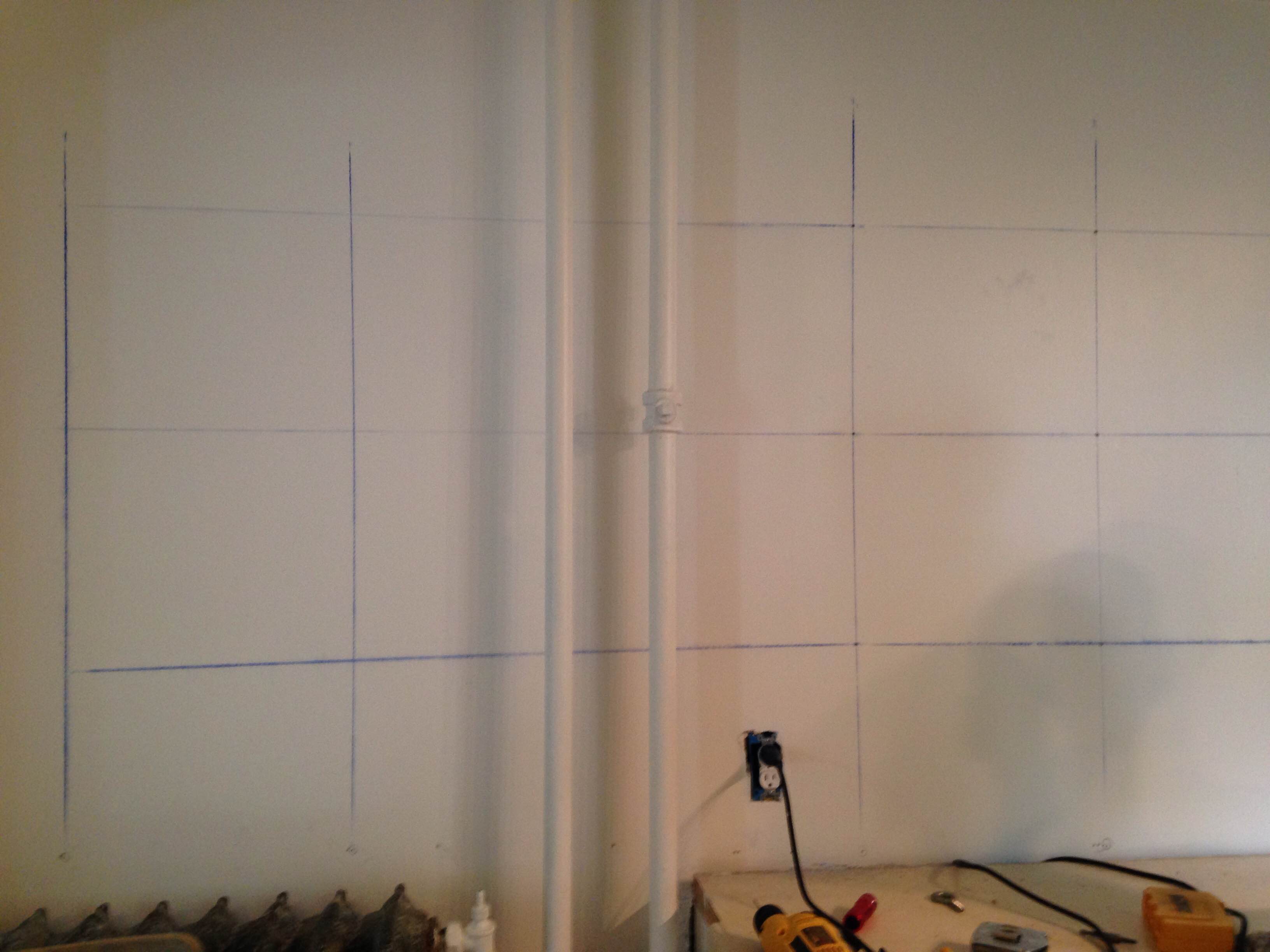 Before we could hang the shelves, though, we had to mark out where the studs were located. This was a difficult job because a stud-finder wouldn’t work through the 1/4 inch drywall, plaster and lathe. S and his grandfather were finally able to locate them by referencing the screws holding the lower cabinets to the wall, and drilling a few test holes to see where the edges of the stud were located. S and I drew a grid on the wall with chalk lines and a level, and S drilled the pilot holes for the brackets.