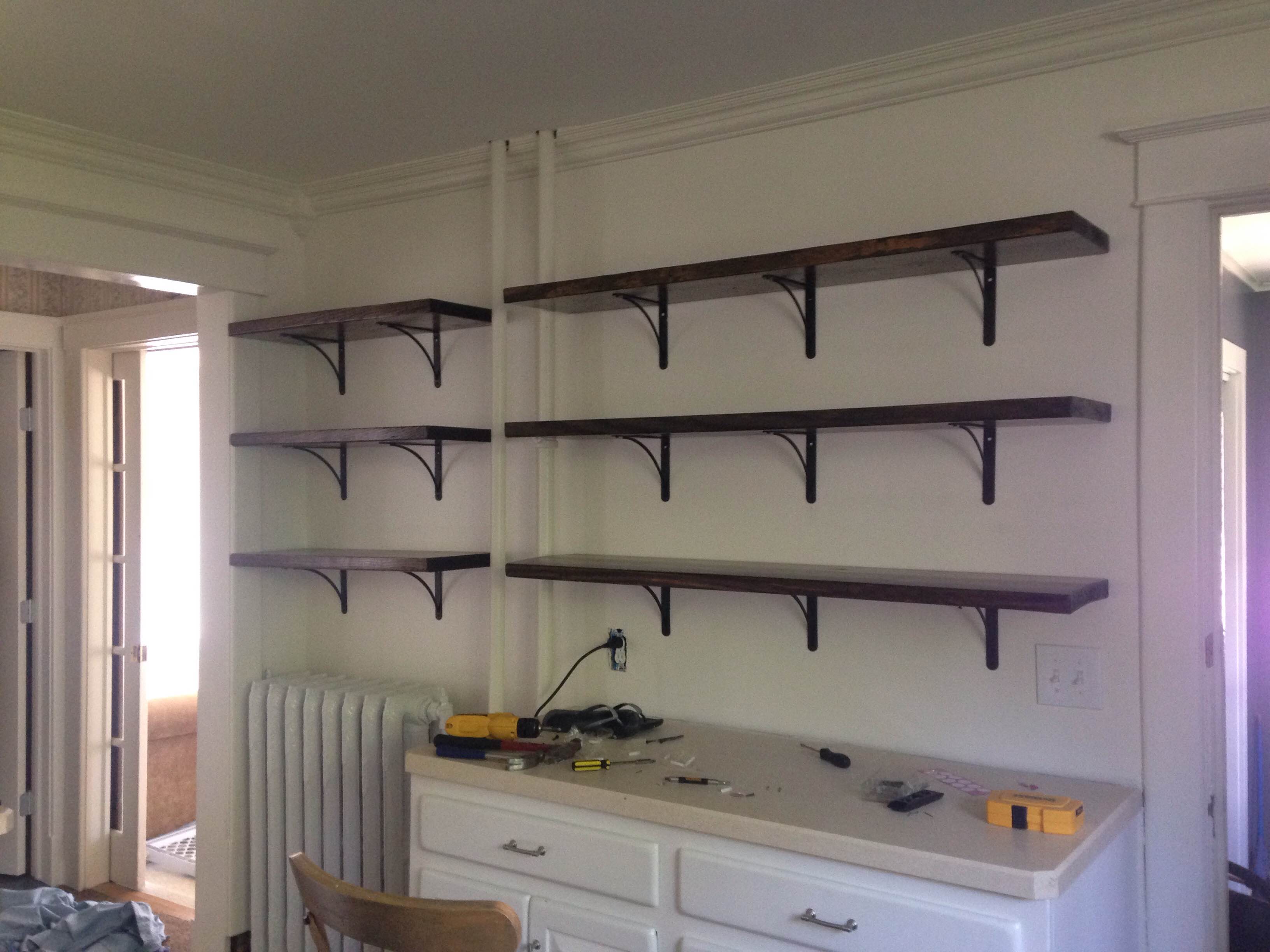 And, FINALLY, we could hang the shelves! Drilling the brackets to the wall and screwing the shelves down only took about an hour and a half one morning.