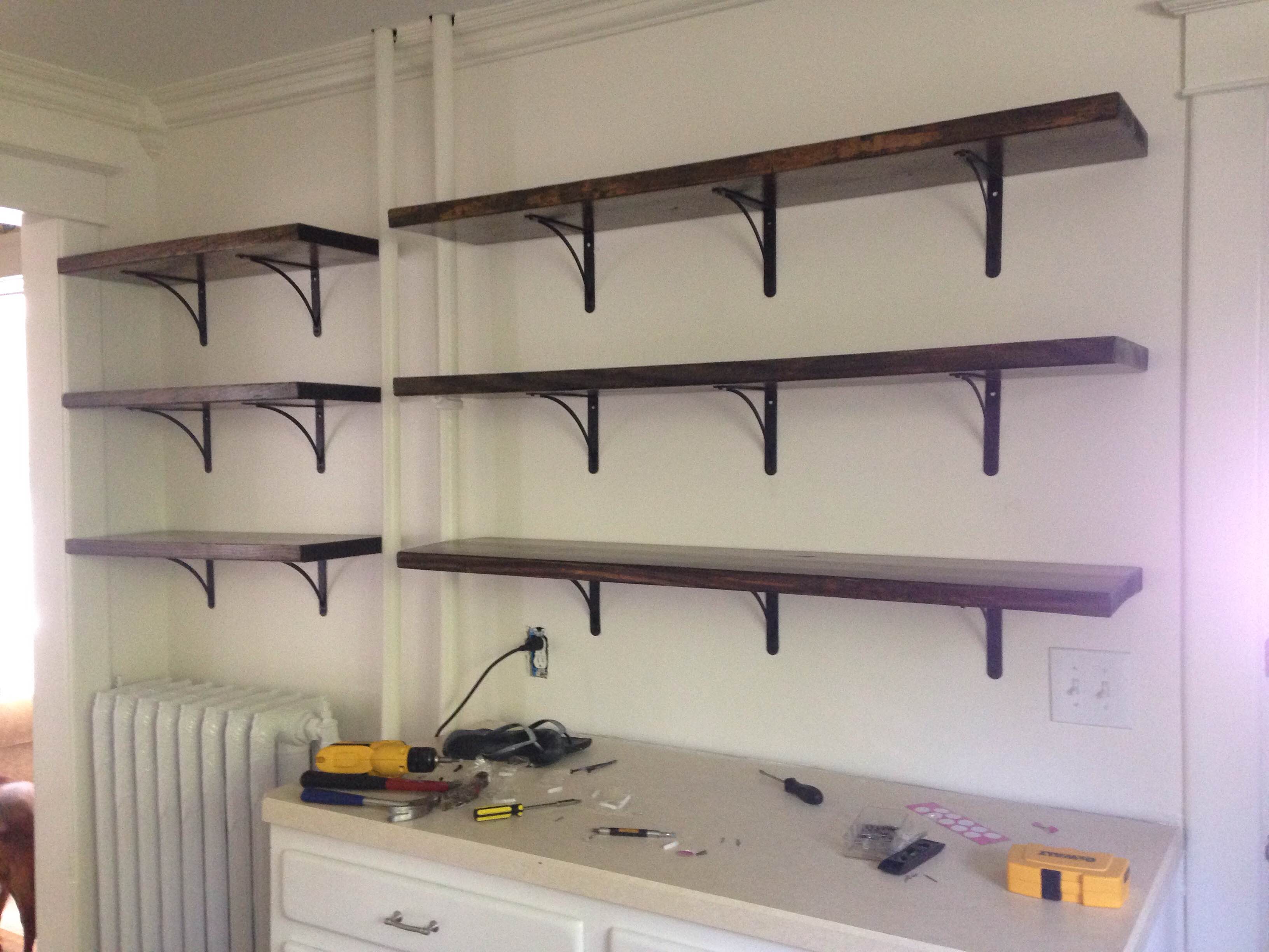 Anyway, we were confident we would love them. We bought inexpensive brackets from Lowe’s and simple pine framing lumber that was 2 inches thick to build the shelves. The only drawback of framing lumber is that it can be bowed and have knots. Depending on the application or the look you’re going for, this may not be a problem. Just taking the time to go through the pile of boards and find the perfect pieces can avoid both of those problems. We had the boards cut to size at the lumber yard (the total for four 12-foot boards was $48), and we have three scrap pieces leftover. S and I sanded the boards with an orbital sander, and then lightly sanded them again by hand with a finer grit sandpaper. Then S used a wood conditioner, stained them (Minwax Dark Walnut), and applied two coats of satin polyurethane. I chose which parts of the boards I wanted to face up or down based on which side looked better.