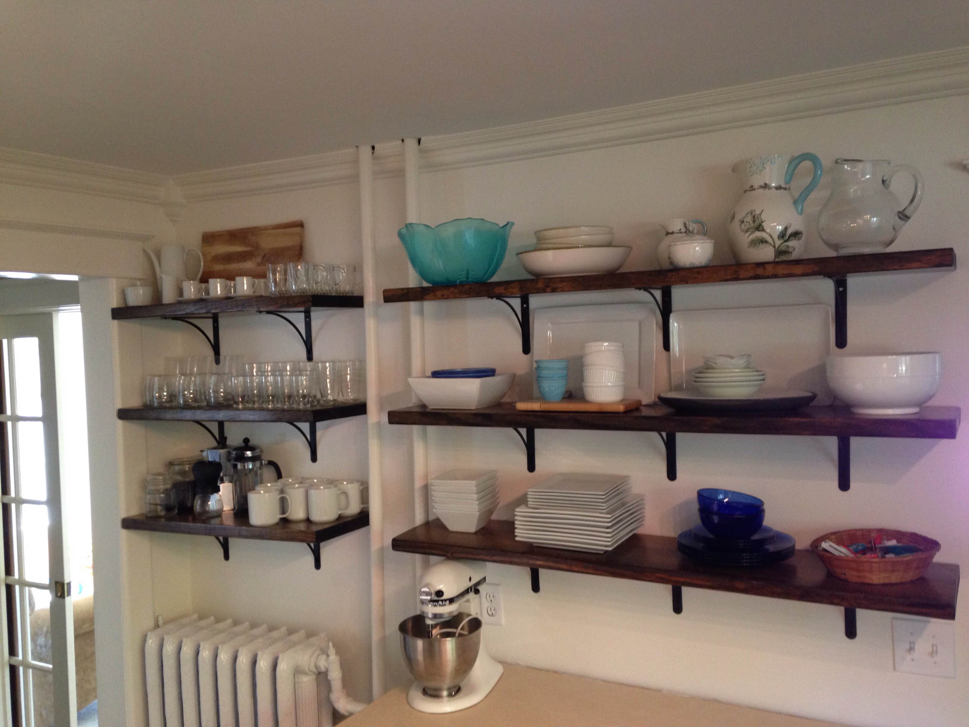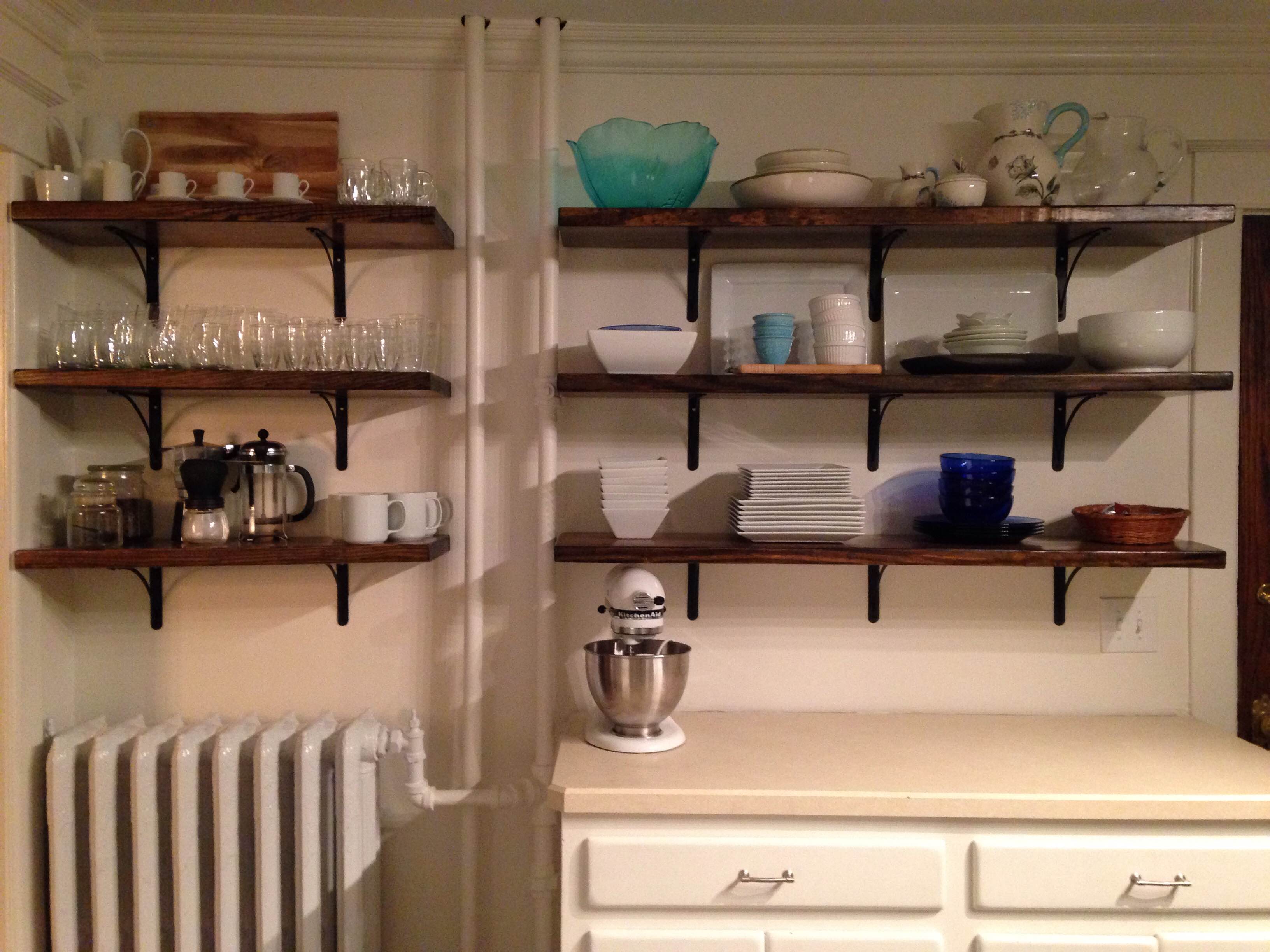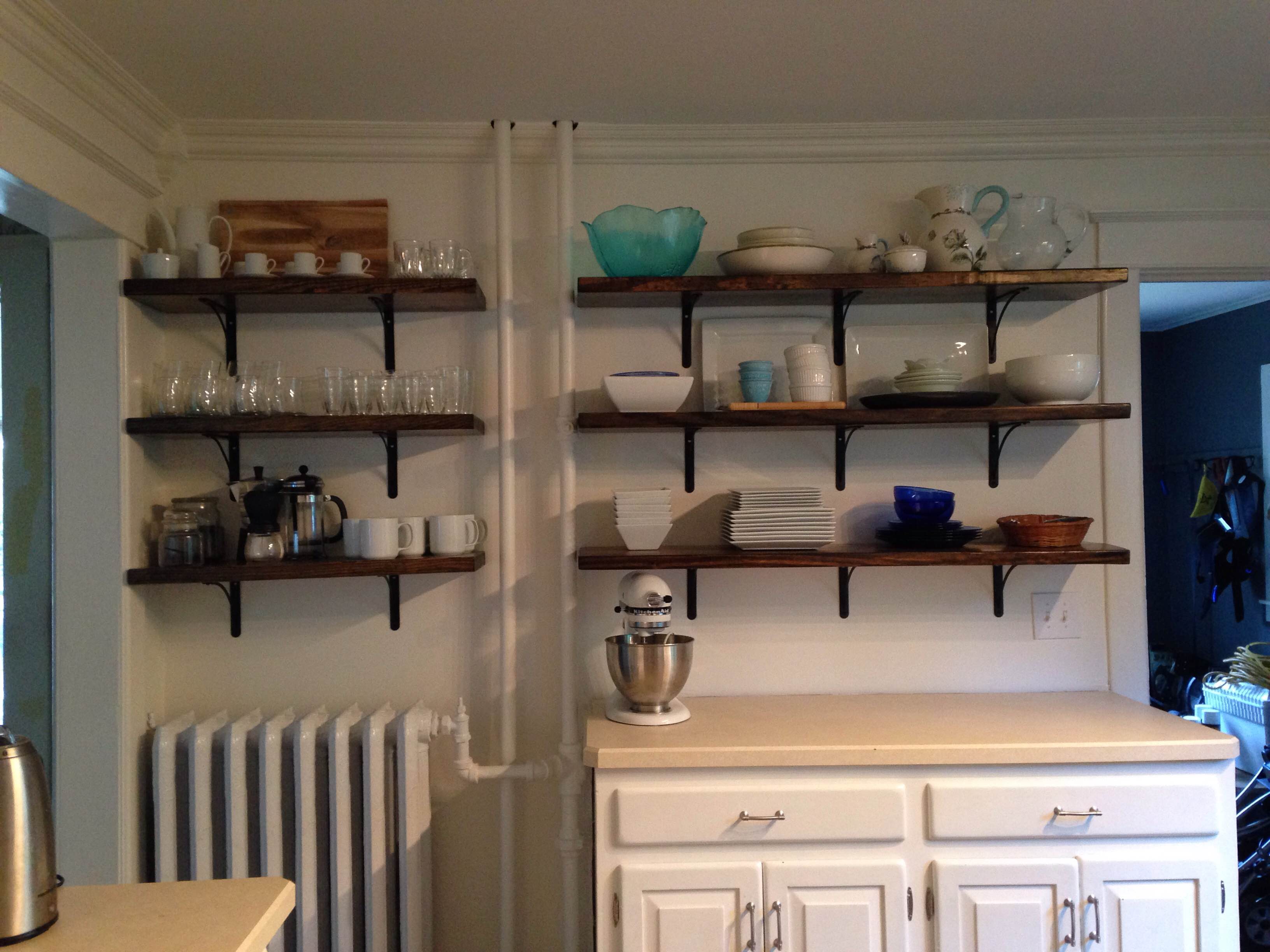 As of a few weeks ago, we had a painted kitchen that was still in need of some baseboards and molding, with a chipped, unpainted radiator, and no additional storage besides the lower cabinets. We have been planning to install open shelving on the wall with the door, which does not have subway tile, since taking down the upper cabinets. While I know this can be a polarizing choice, I knew it would be right for us. We love the light look of open shelving, and the way it manages to look both modern (clean lines, minimalism), and old-world (picture Downton Abbey’s basement kitchen with its pretty pots on display). We love to walk the line between those two styles in our house, because it matches our tastes with the era of the house, which was built in 1901. We are not really neat-freaks, and the shelves would be far enough from the stove, that I wasn’t really worried about the dust or grease. Plus, I have no problem rinsing or washing a bowl before I use it, while the plates and cups would stay clean just because we use them every day.