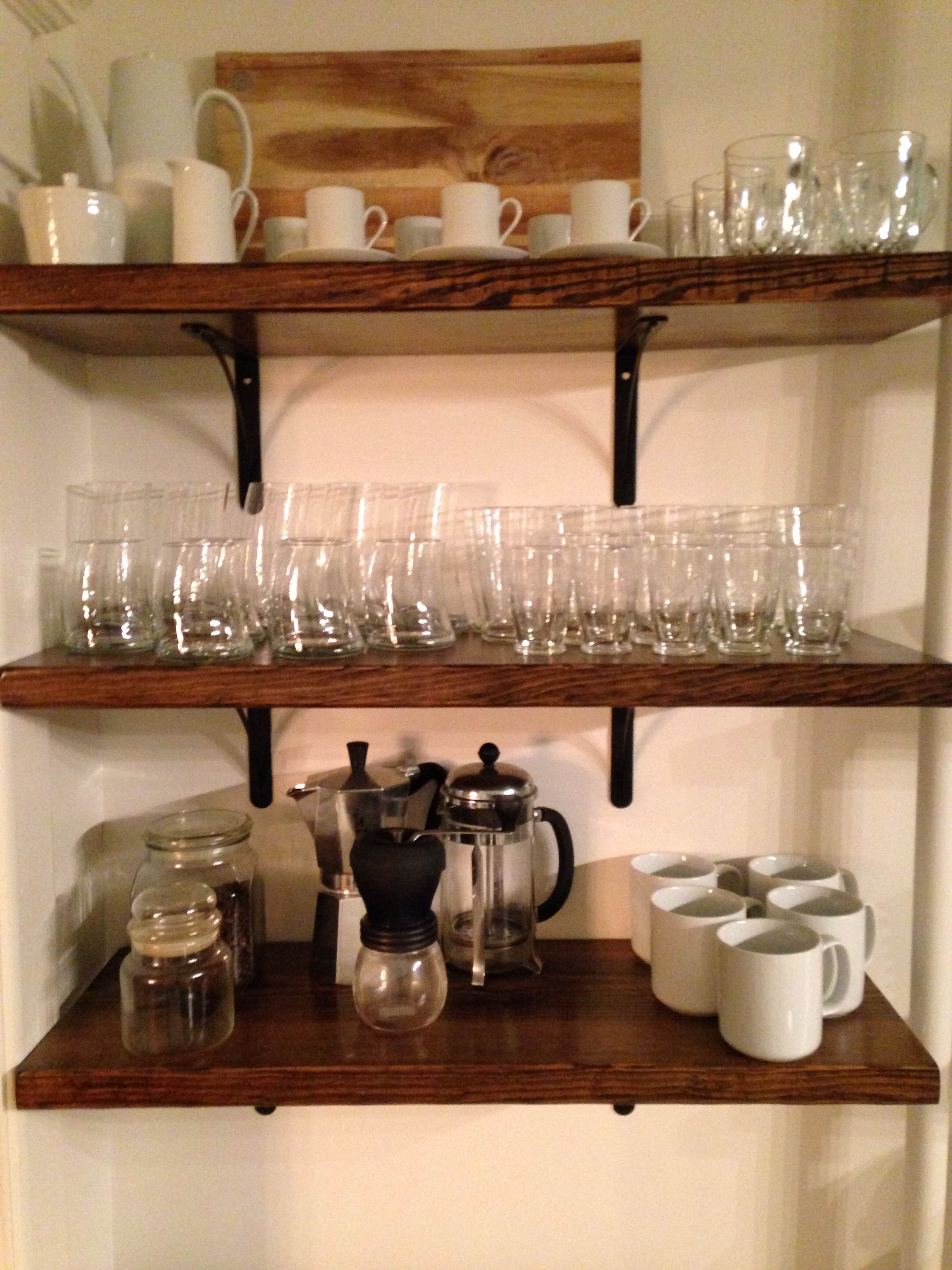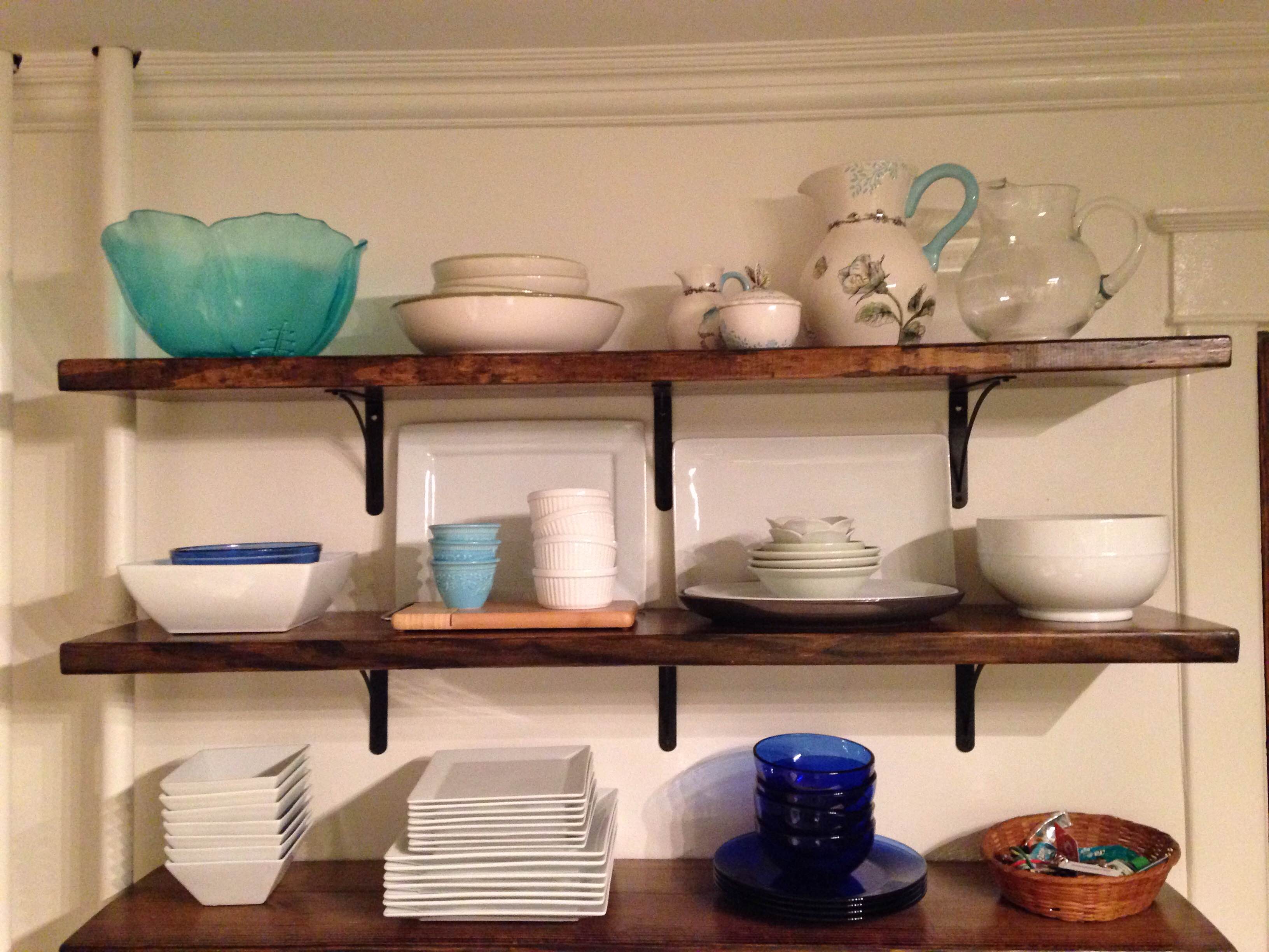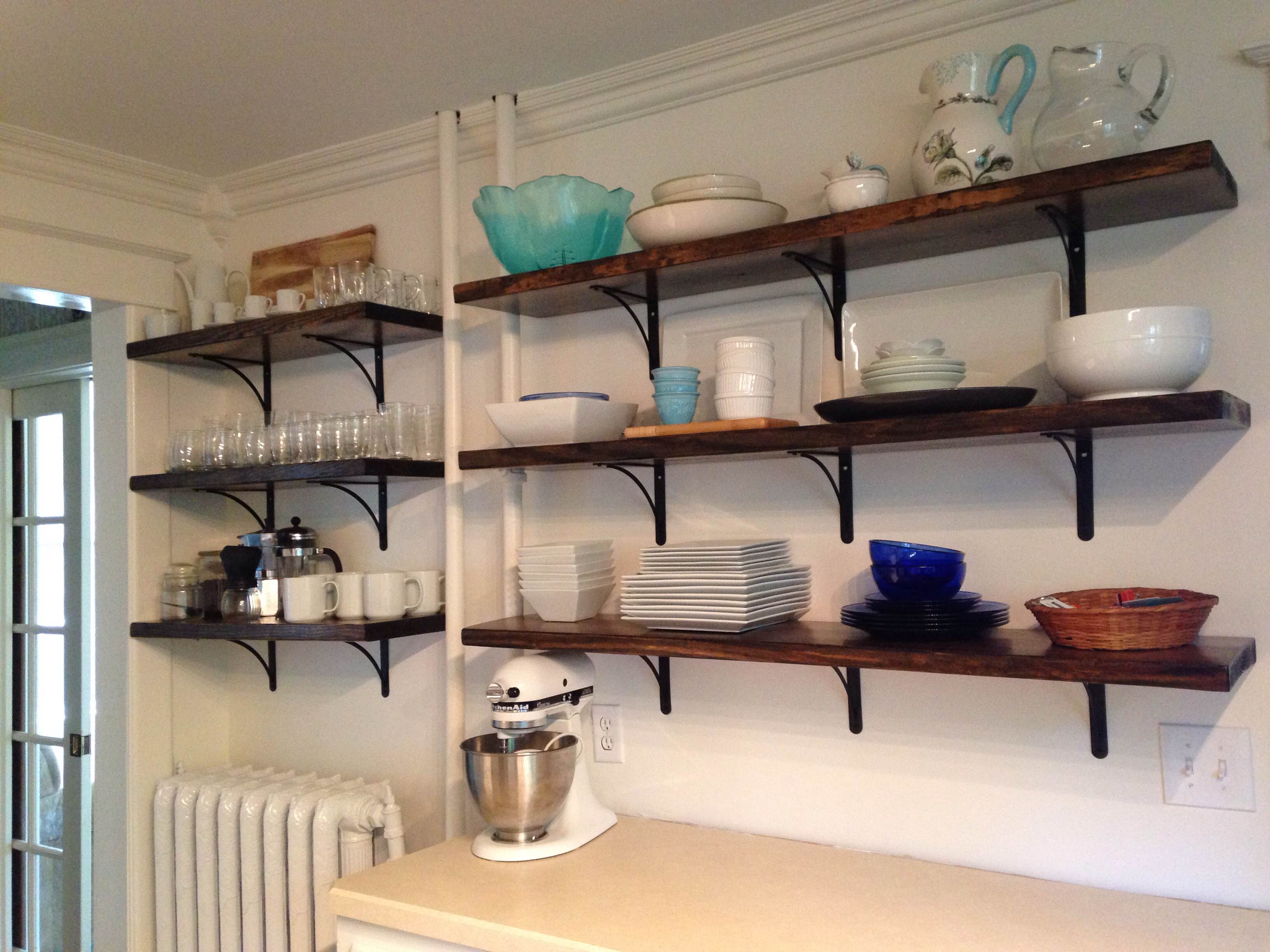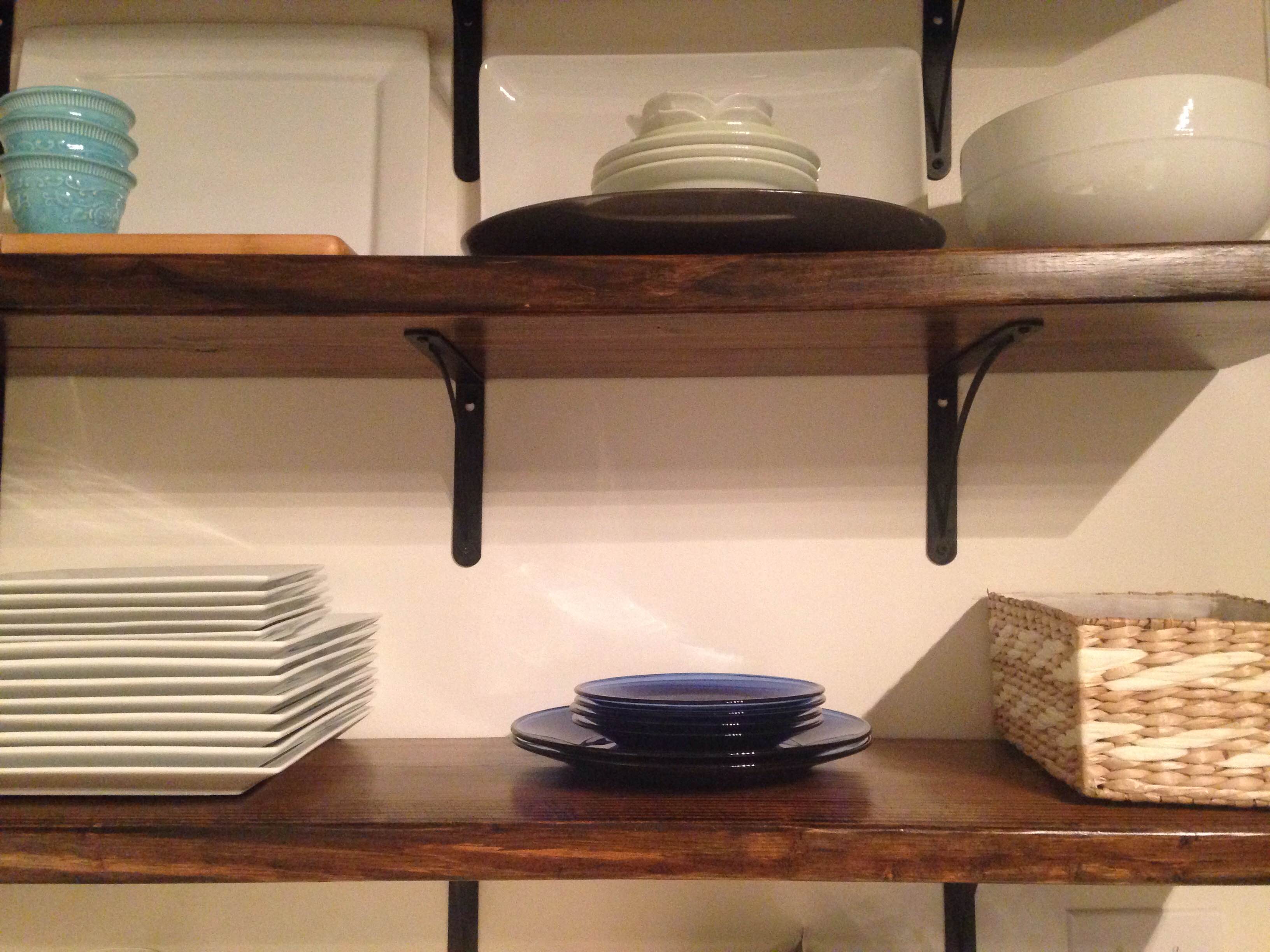 As of a few weeks ago, we had a painted kitchen that was still in need of some baseboards and molding, with a chipped, unpainted radiator, and no additional storage besides the lower cabinets. We have been planning to install open shelving on the wall with the door, which does not have subway tile, since taking down the upper cabinets. While I know this can be a polarizing choice, I knew it would be right for us. We love the light look of open shelving, and the way it manages to look both modern (clean lines, minimalism), and old-world (picture Downton Abbey’s basement kitchen with its pretty pots on display). We love to walk the line between those two styles in our house, because it matches our tastes with the era of the house, which was built in 1901. We are not really neat-freaks, and the shelves would be far enough from the stove, that I wasn’t really worried about the dust or grease. Plus, I have no problem rinsing or washing a bowl before I use it, while the plates and cups would stay clean just because we use them every day.