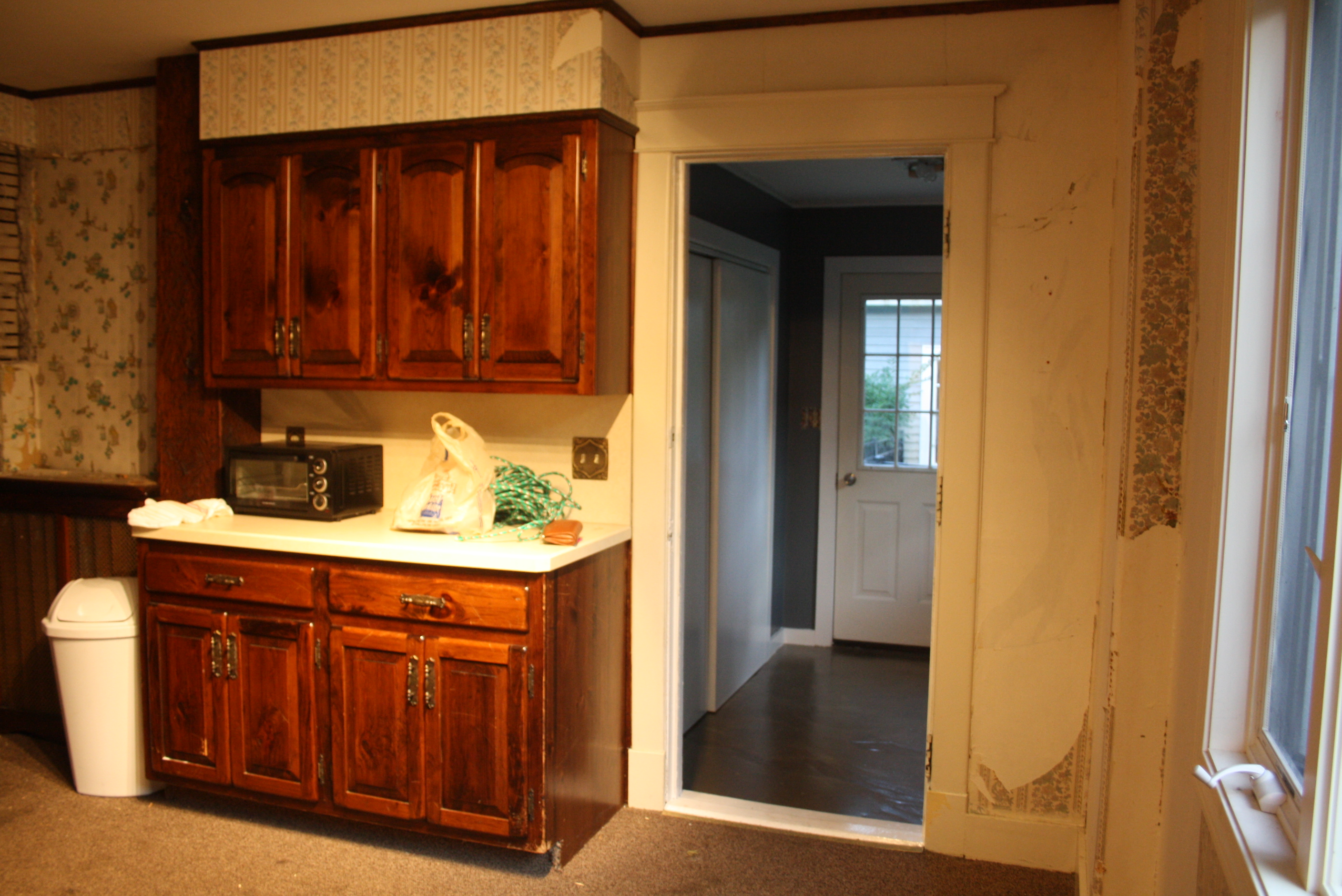 When we moved into our house a year and a half ago, the entrance to our kitchen looked like this (minus a little demolition over the radiator and the peeled wallpaper):
