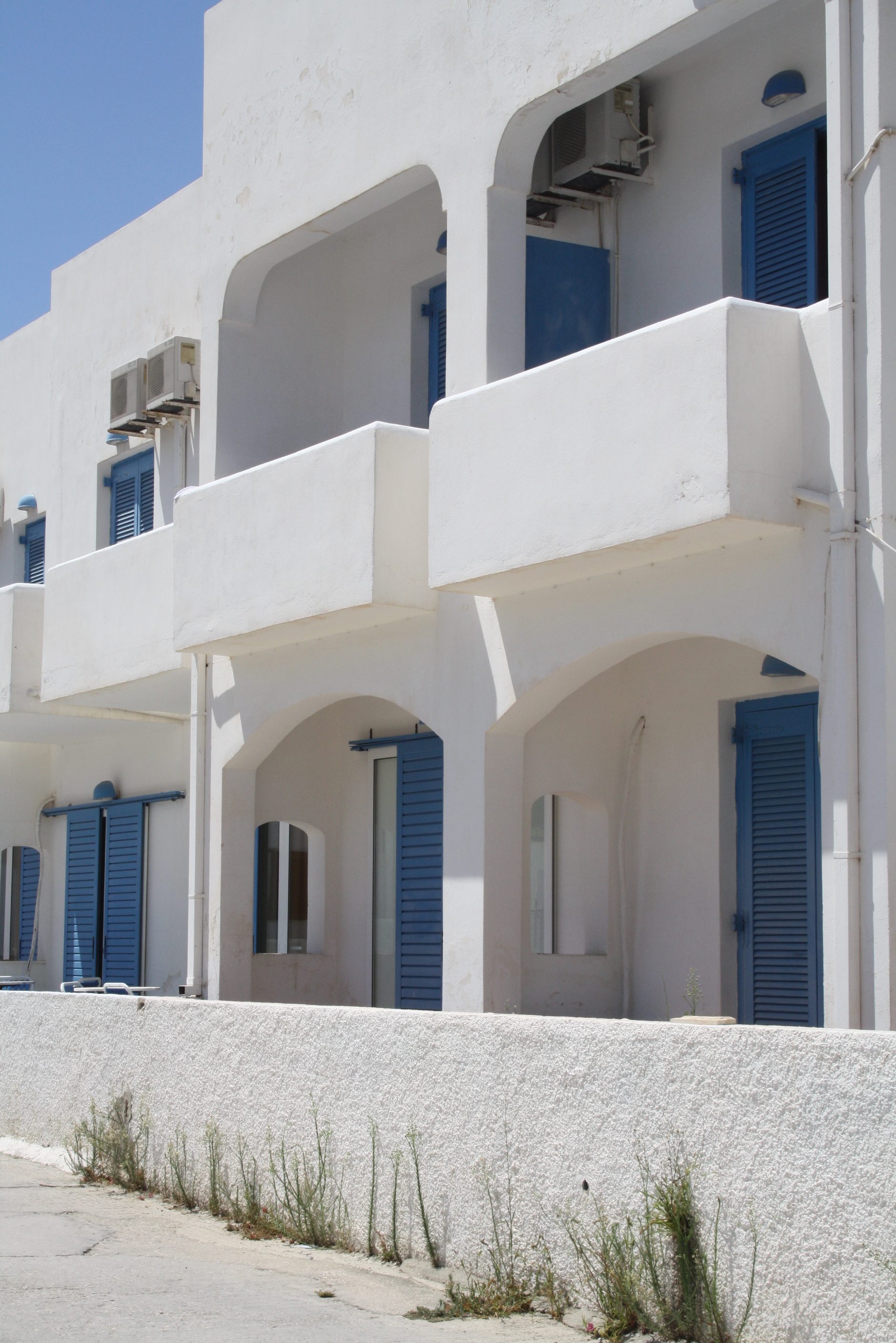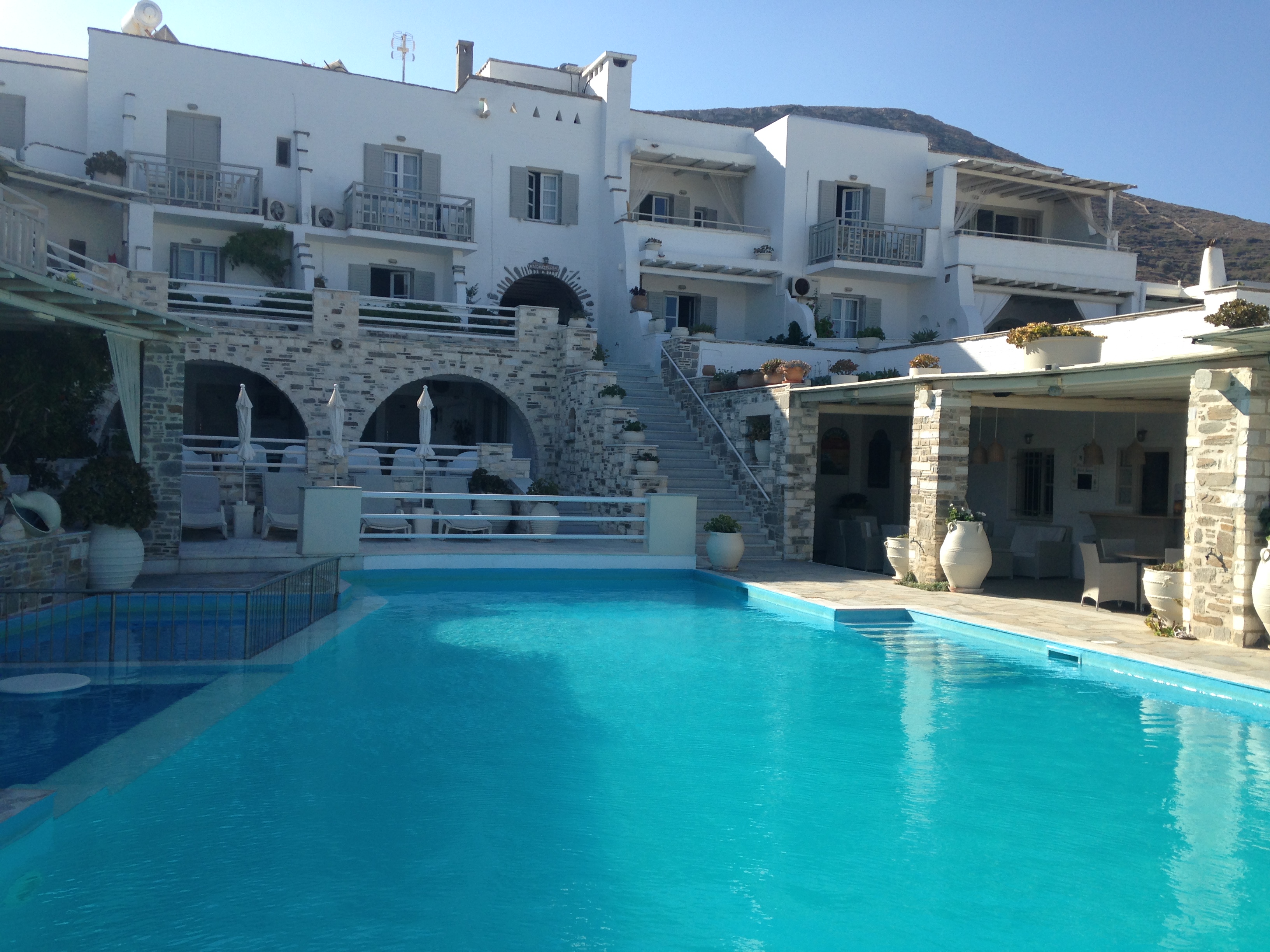Thankfully, as soon as we got to our hotel on Paros, we were in heaven. The Sunset View hotel is about a 10-minute walk from the port (they send a car to pick you up at the ferry with your luggage), and was the most beautiful, relaxing hotel. The views from it were stunning, the pool was gorgeous, breakfast each day was simple and delicious, and the food from the snack bar was great. The staff was so accommodating, helpful and friendly, which makes a good vacation great. We stayed in a 6-person suite, which had one bedroom with a king bed and twin (S, G and I shared the king and the twin was unused), a middle room with a tv and two more twin beds, a bathroom, and an eat-in kitchen that also had a twin bed in it. It may sound like a strange set up, but we were staying with family, so it was perfect. Each room opened up to the shared veranda with big glass doors and gauzy curtains. The veranda had gorgeous views over Parikia (the port city) and the port, and the sunsets were amazing (as the name implies)! I can’t say enough about how much we loved Sunset View.