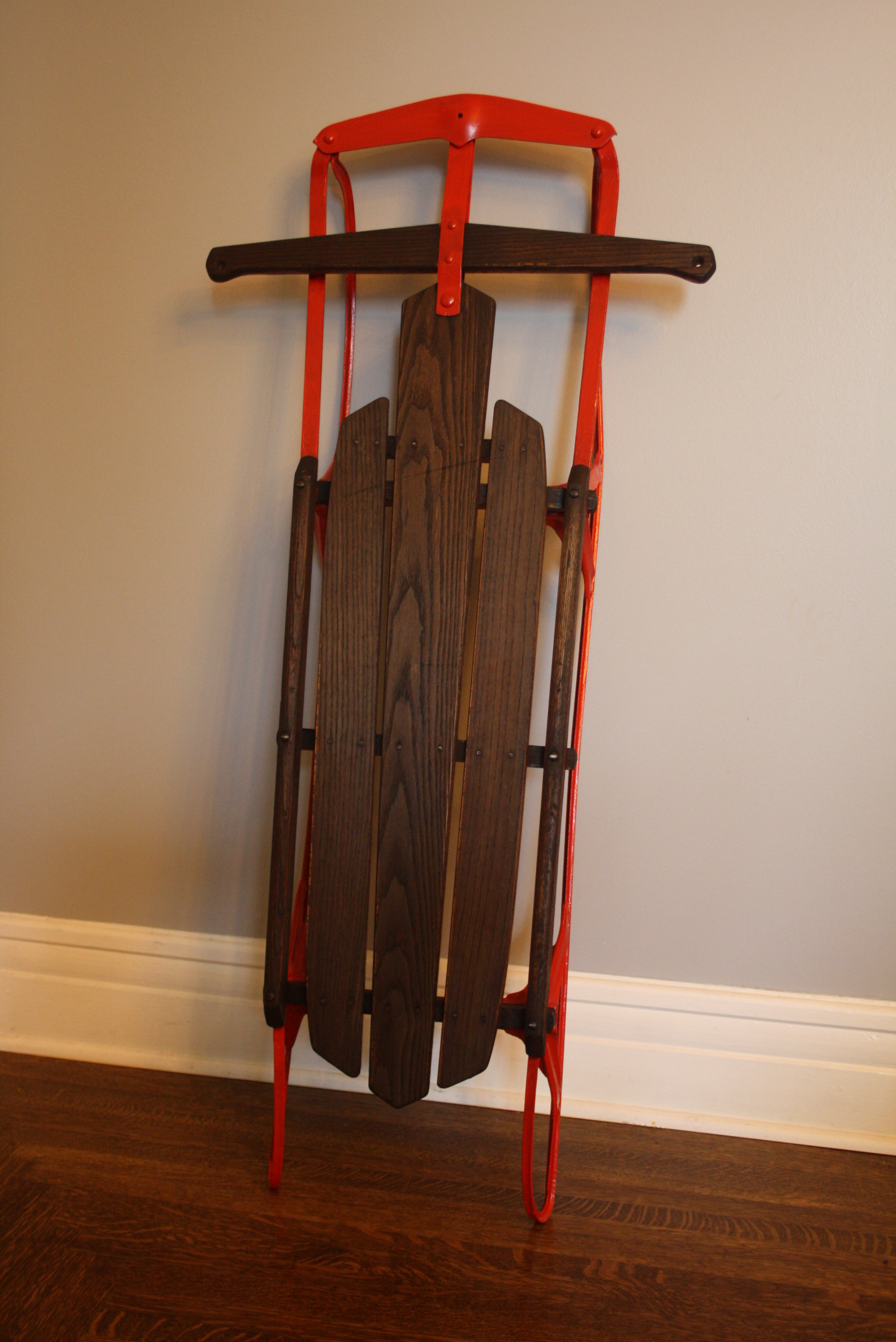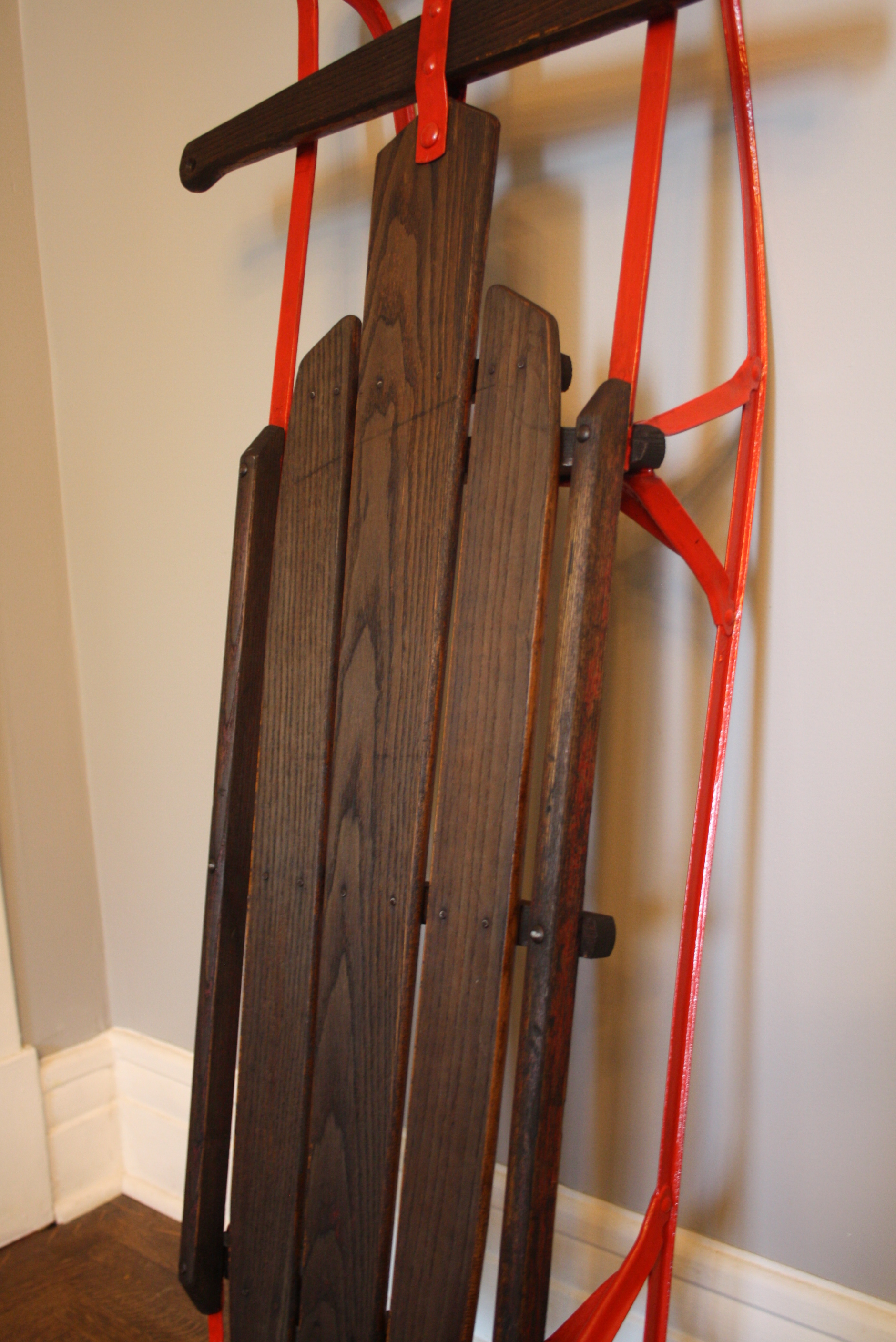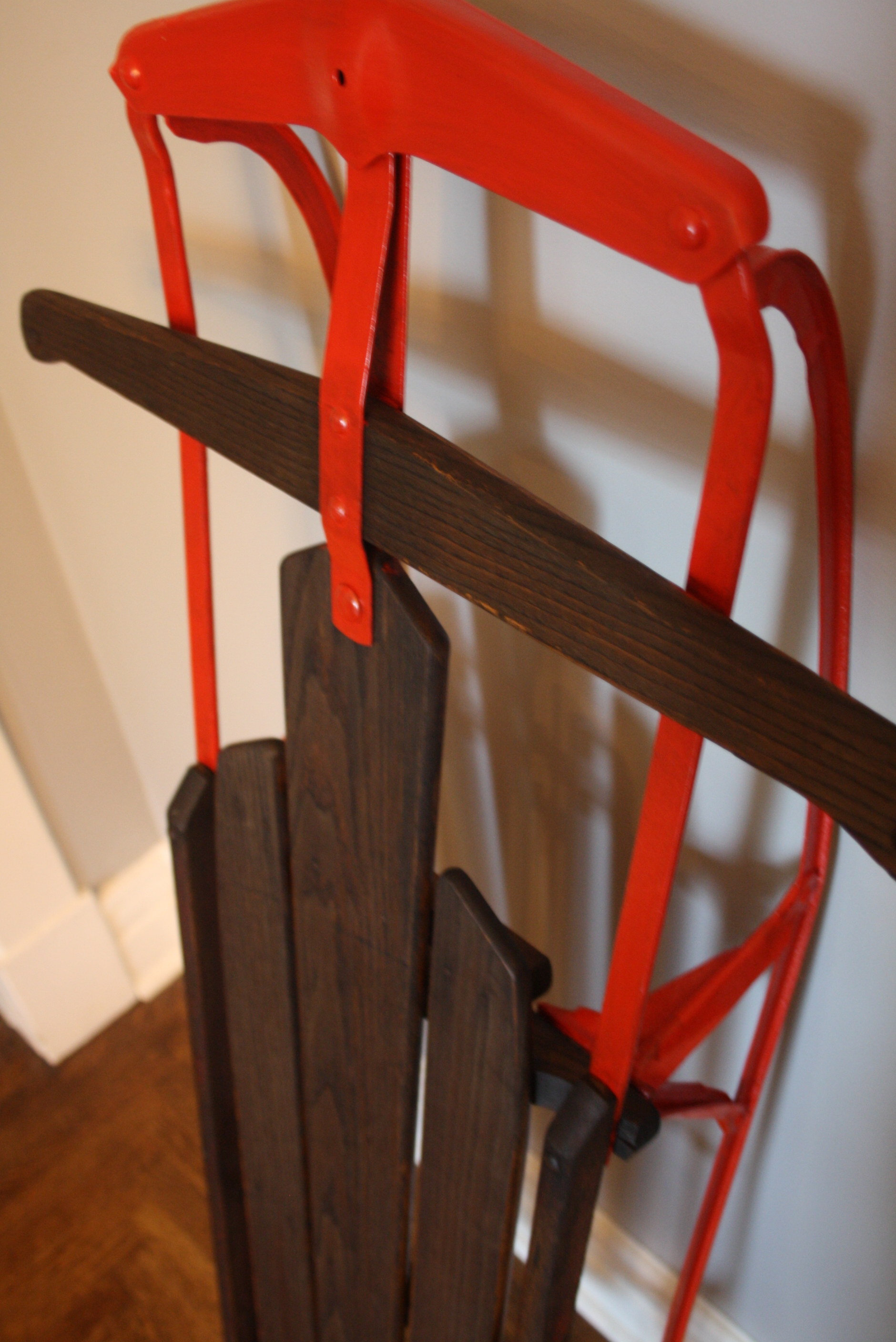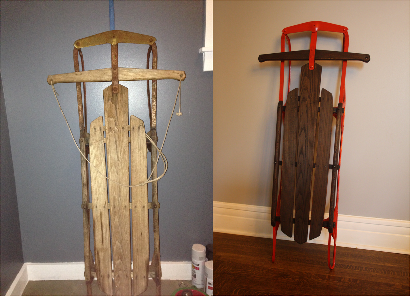 S sanded it and used steel wool to get off some of the rust last year, and I finally got around to painting and staining it recently. I know a lot of people keep these sleds in their vintage condition for decor, but I can never resist the urge to make things look shiny and new. I used a Rustoleum red gloss paint for the metal and stained the wood with Minwax Dark Walnut. Now, I just need to add a gold or silver ribbon for the pull and it will be a sled fit for a winter wonderland. I can’t believe I’m saying this in October, but I can’t wait to decorate for Christmas!