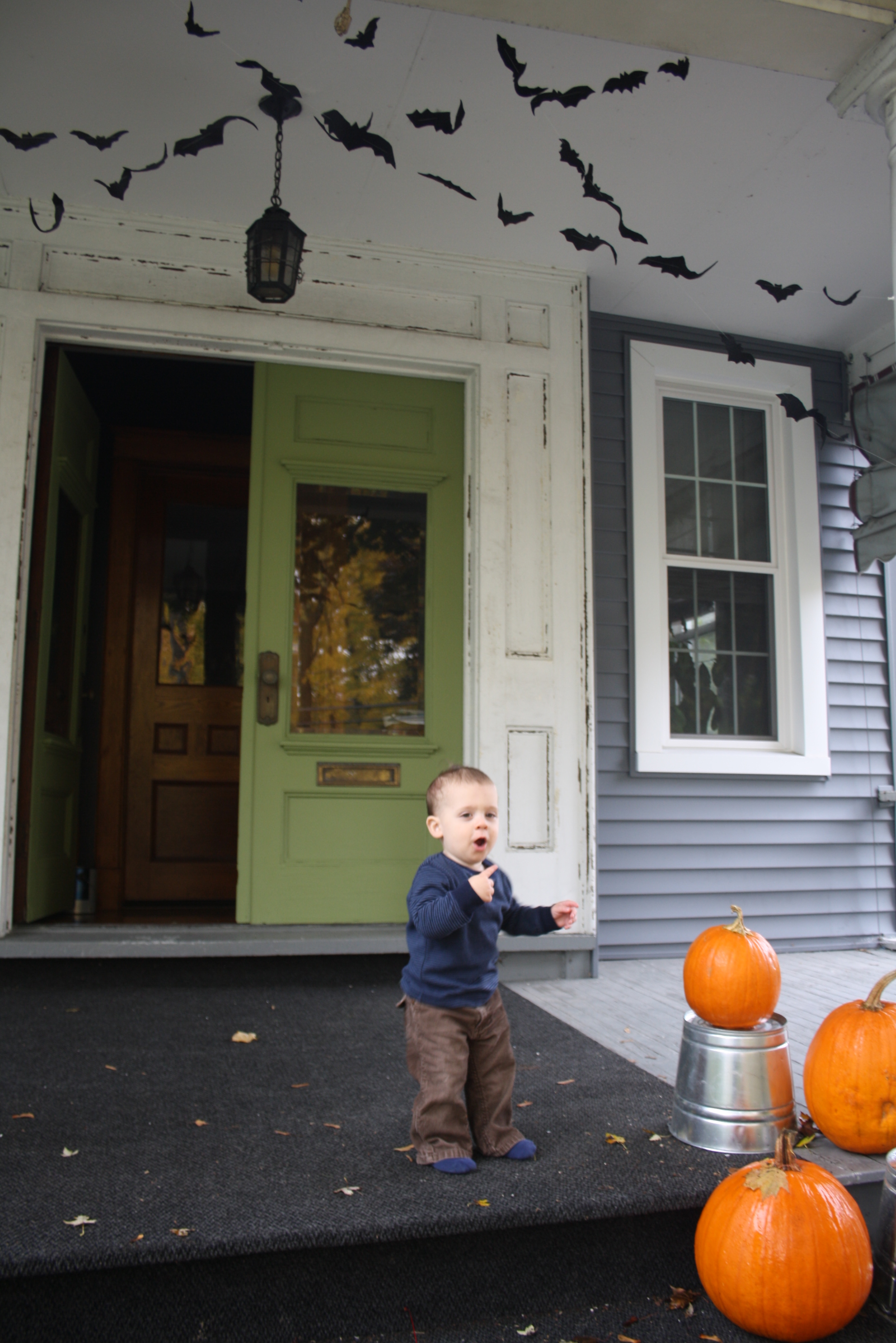 Halloween is in two days and I finally managed to put up a themed decoration earlier this week. I am not a huge fan of elaborate Halloween decorations, but I was inspired by this picture (via Apartment Therapy) to create a simple swarm of bats for our front porch, to liven things up for trick-or-treaters on Saturday.