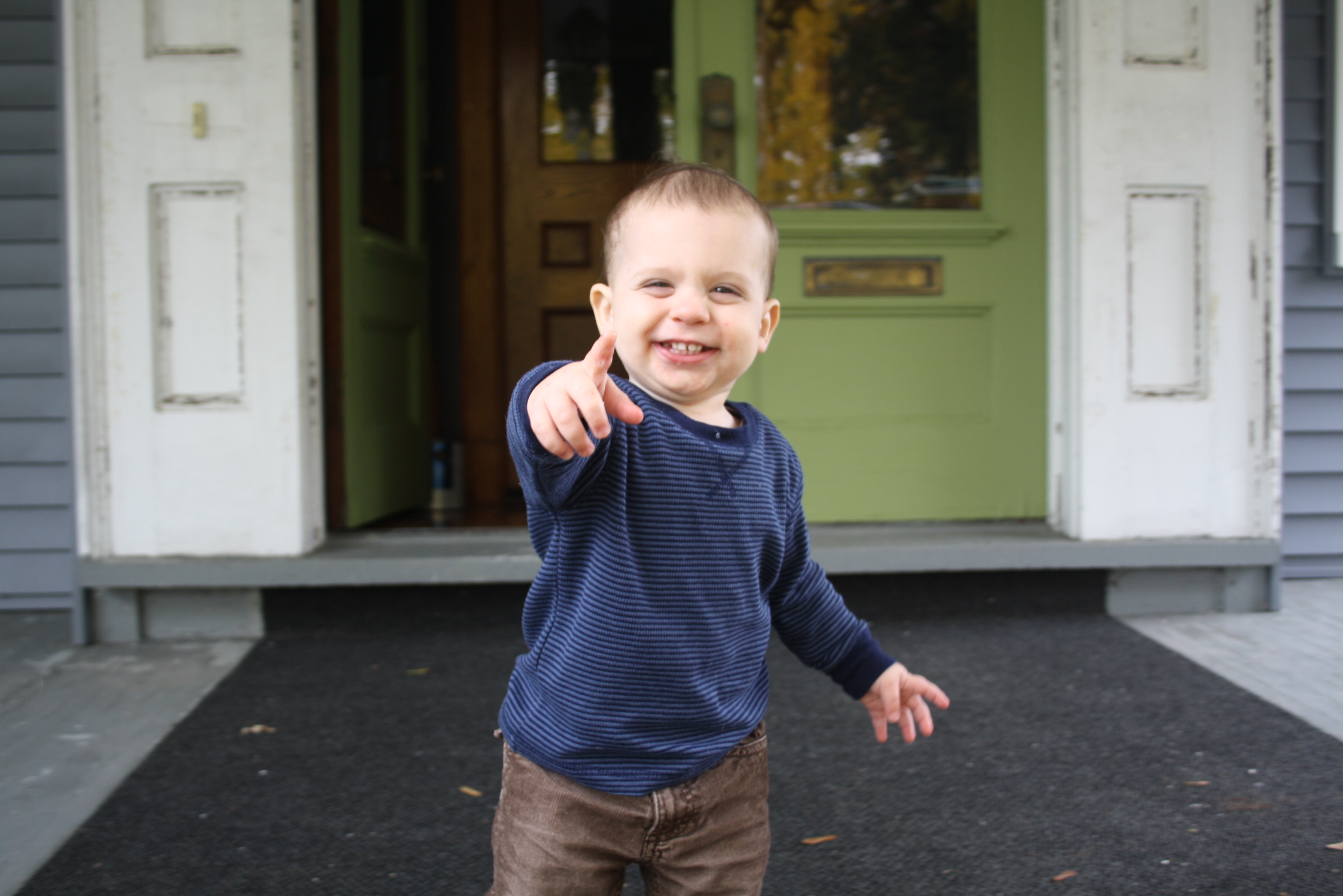 Like all well-planned situations with kids, this photo did not go as smoothly as we would have liked! We were rushing to do it between house projects on S’s day off. So, as soon as G woke up from a nap, we changed our clothes and ran to get the neighbor next door (a retired professional photographer) who had agreed to take the photo for us, and of course he had stepped out on an errand. So we waited for him for about 20 minutes, in which time G became extremely annoyed because he wanted his lunch, and then we had to bribe him with a cracker to even get him to sit down between us for a few photos (none of which captured a smile!). At least it will be a funny story to tell when he’s older, right? We just love that little guy, and can’t wait to meet his little brother or sister!