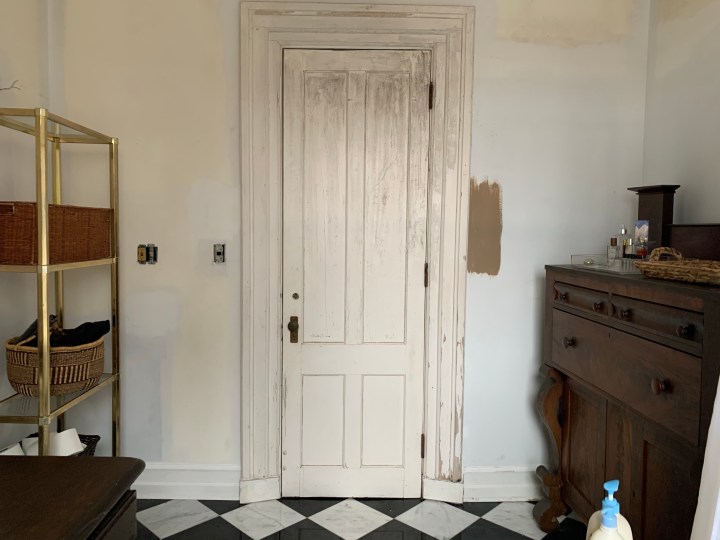 I was having the hardest time deciding on a paint color for the walls and the shade of brown came to me in the middle of the night and brought all my ideas together. I think with gold-framed vintage and modern art, the wood tones of the furniture, the contrast of bright-white trim, and the black and white floors it will feel more aged and elegant rather than new and utilitarian, which is the look I prefer for kitchens and bathrooms.