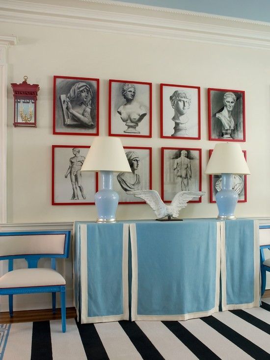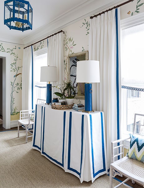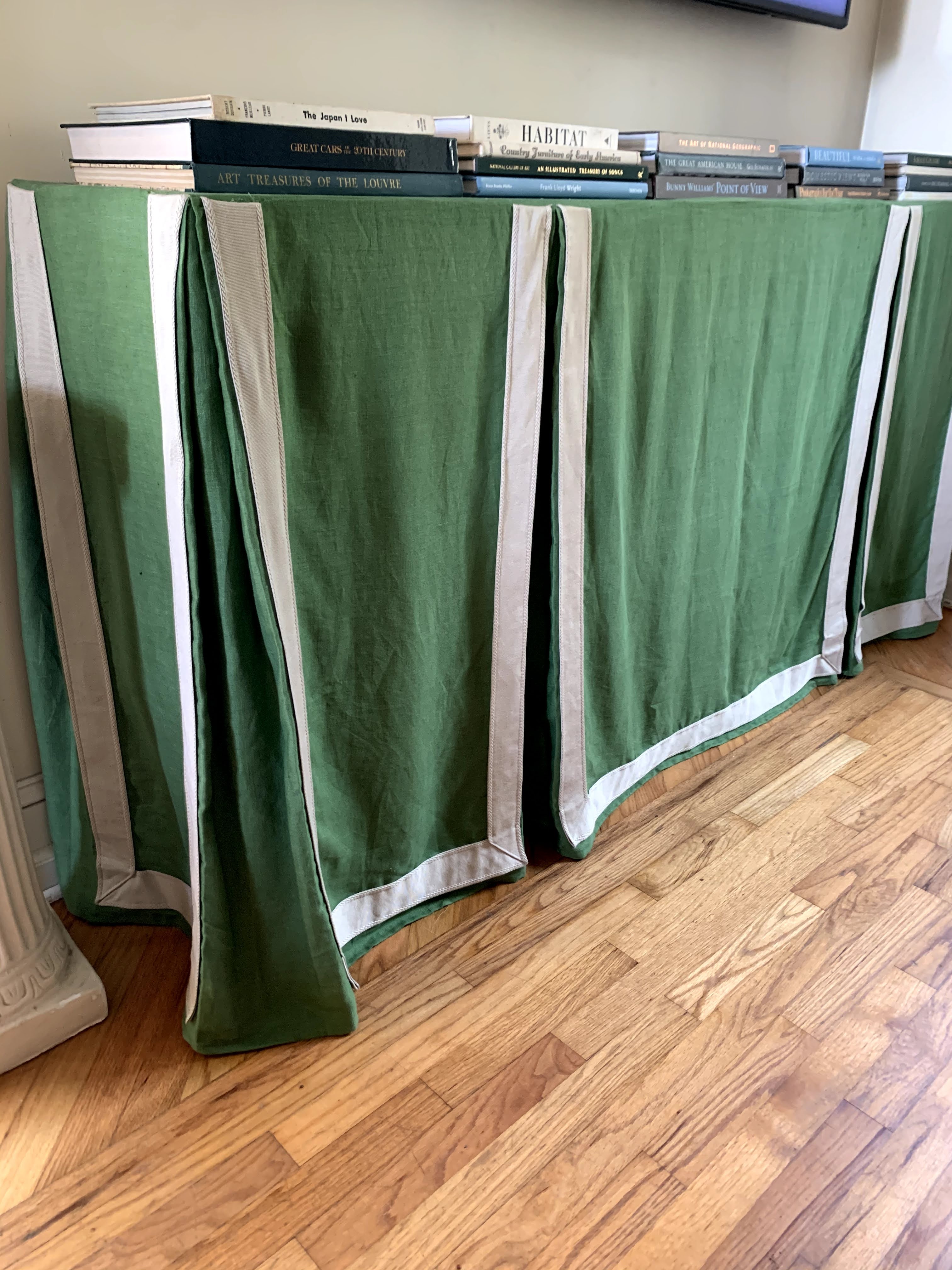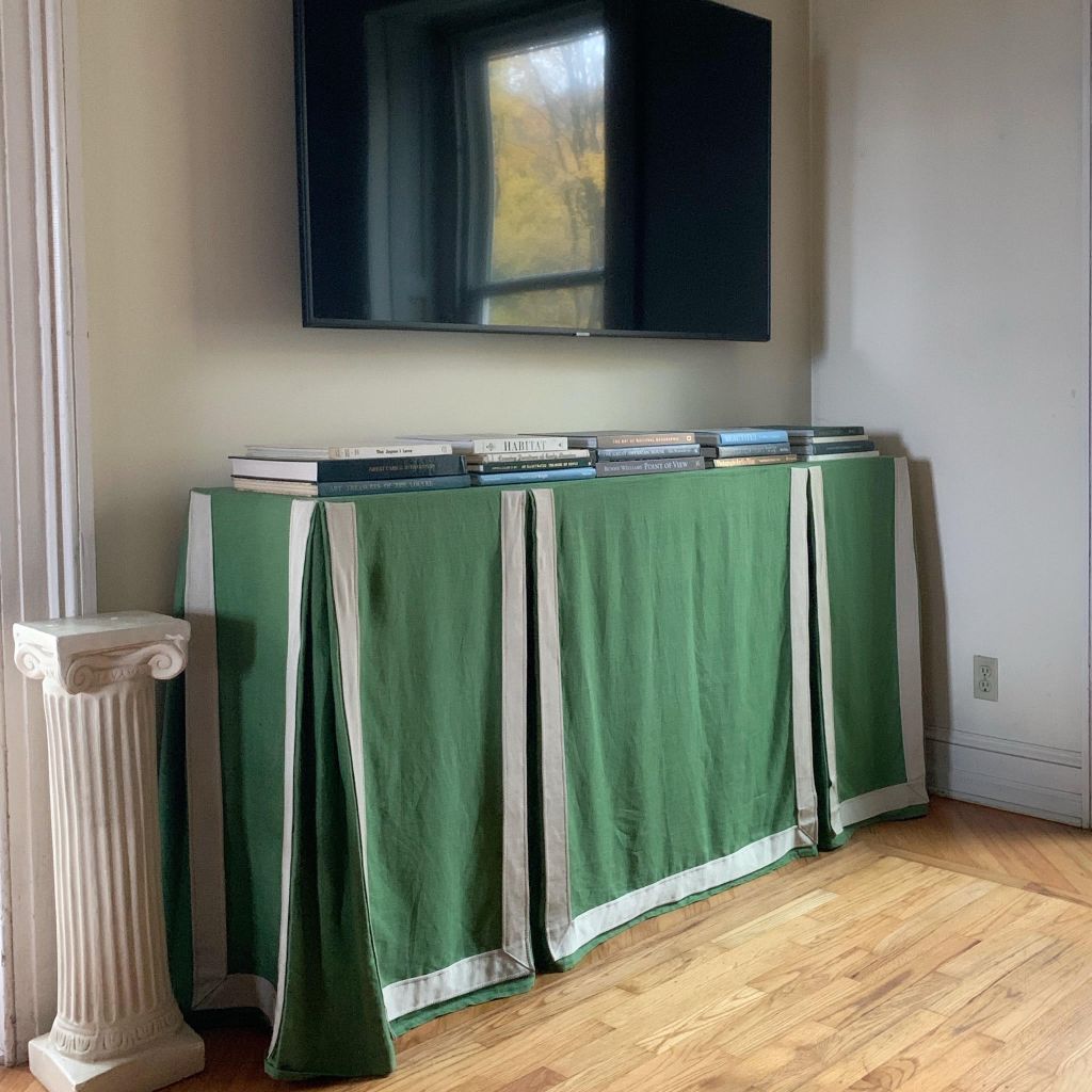 Putting a TV in our living room was never really a question – we are a family that likes watching movies together on the couch – but I wasn’t super excited about the aesthetics of it. Since this house doesn’t have a separate family room, we had to make it work. I thought the best way to make the wall with the television look more formal was to put something traditional and polished underneath the TV. I’ve loved inverted box pleat table skirts for a long time and I think they look especially striking on a long, skinny console table where the shape is accentuated by thick tape trim.