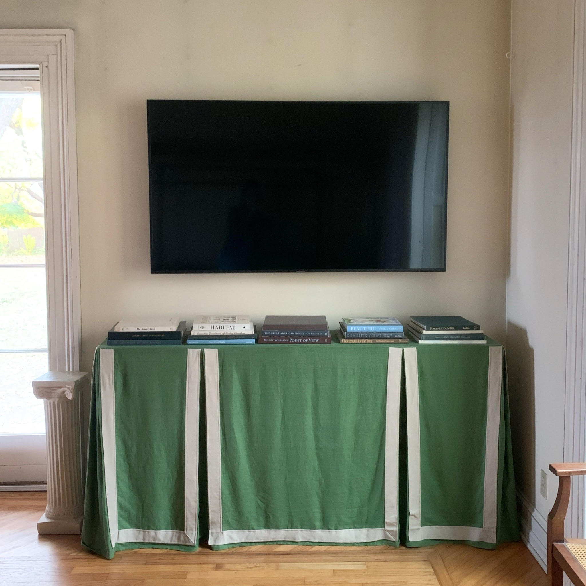 Putting a TV in our living room was never really a question – we are a family that likes watching movies together on the couch – but I wasn’t super excited about the aesthetics of it. Since this house doesn’t have a separate family room, we had to make it work. I thought the best way to make the wall with the television look more formal was to put something traditional and polished underneath the TV. I’ve loved inverted box pleat table skirts for a long time and I think they look especially striking on a long, skinny console table where the shape is accentuated by thick tape trim.