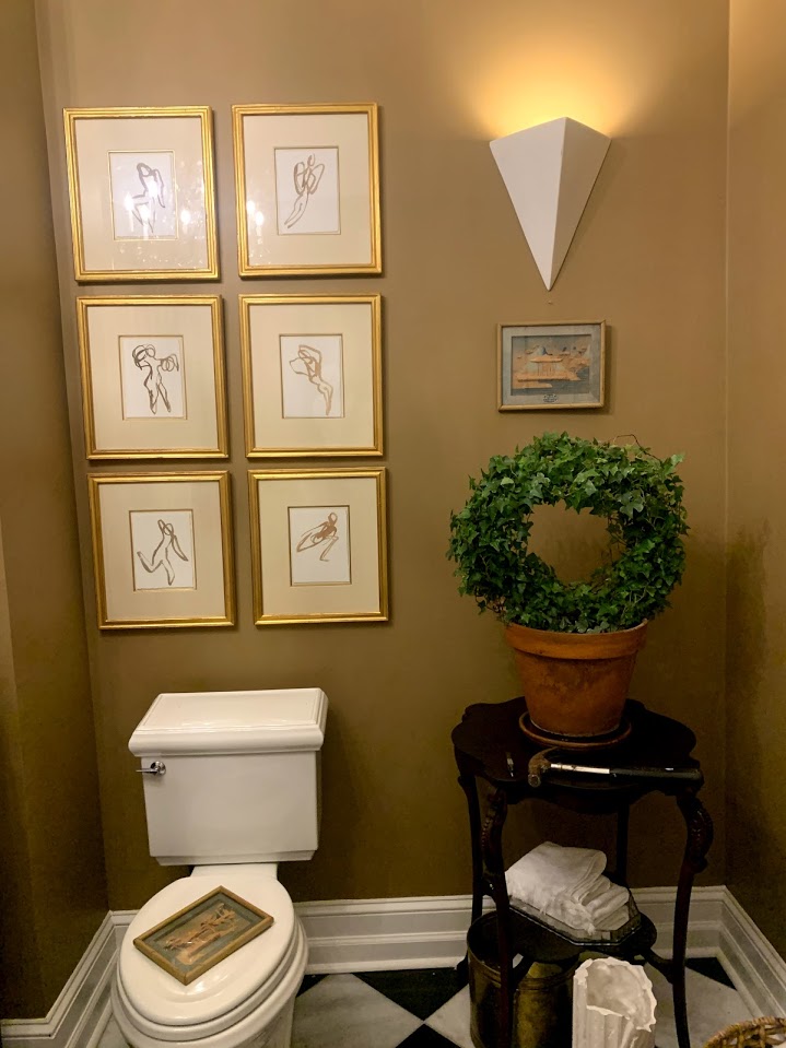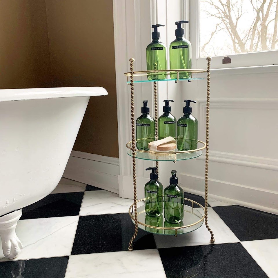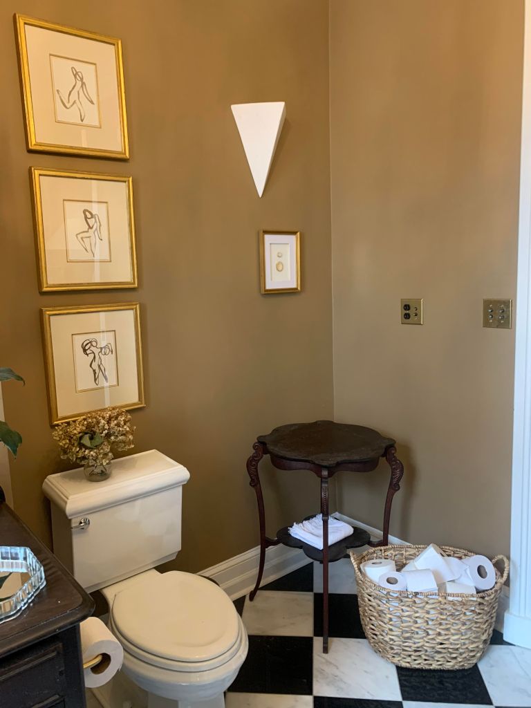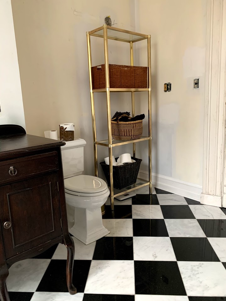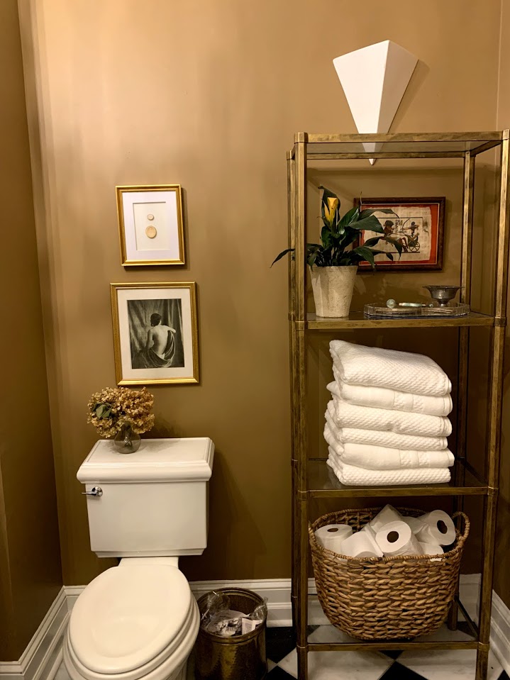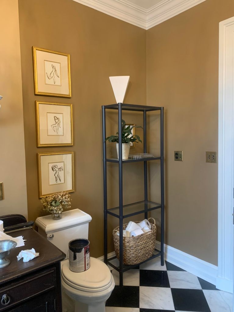 I decided that the etagere just didn’t work in the corner near the toilet — in gold OR black — and switched it out for a table.