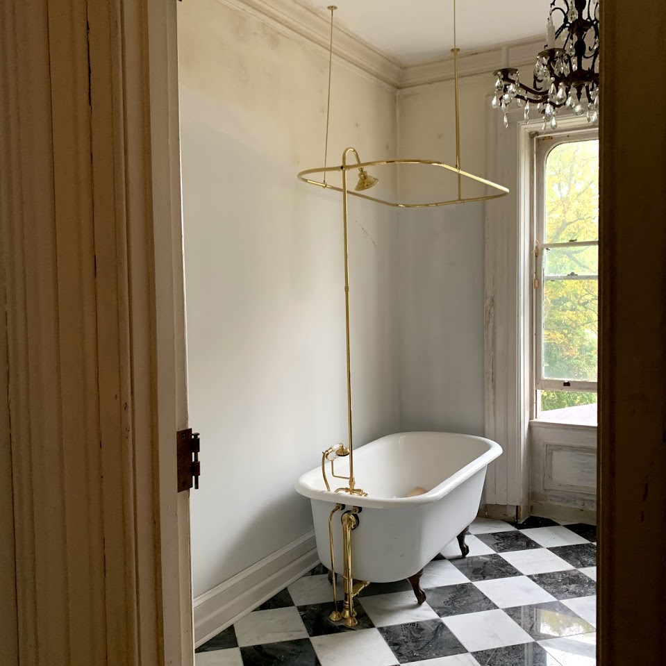 You may remember seeing the before photos, design plan, and progress in this post about one year ago, but I am going to give you a monthly rundown of the bathroom progress anyway, just for fun!