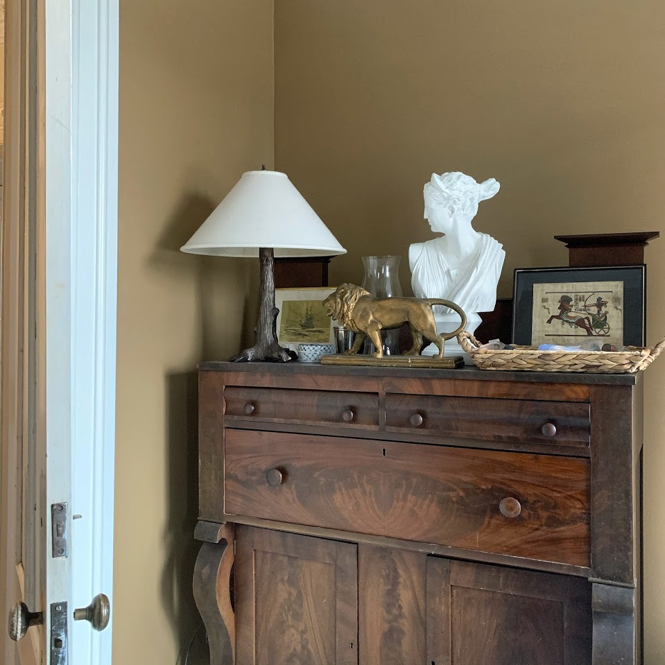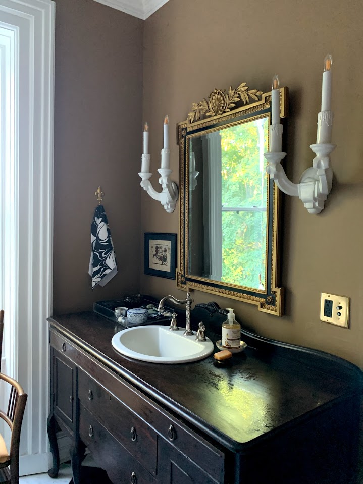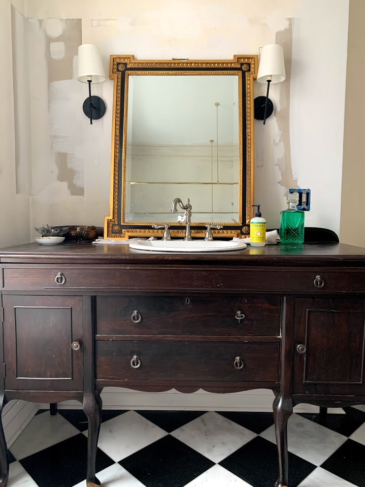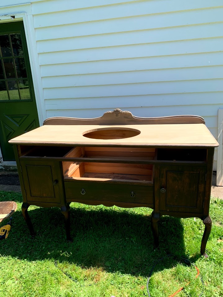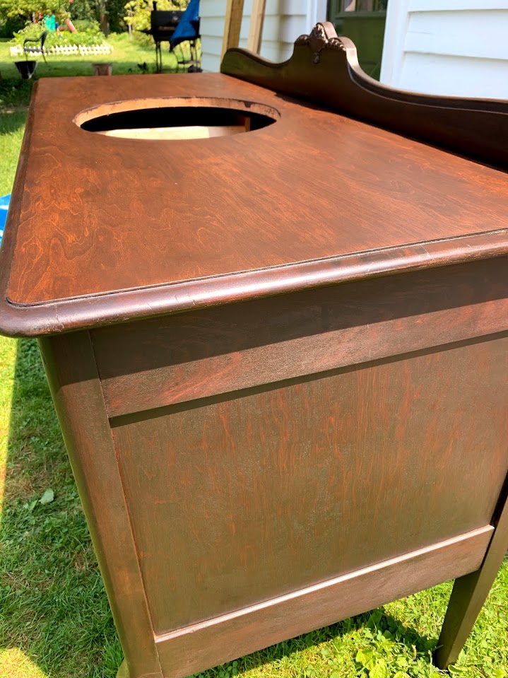 I refinished the top of this antique sideboard to transform it into a bathroom vanity: I was very proud of myself for matching the original stain color.
