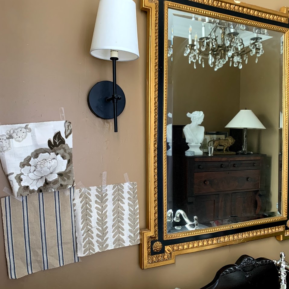 I added the ceiling medallion and the resin grates and finished painting the ceiling, and I chose a fabric for the shower curtain. I’m still in love with so many of those fabrics I sampled below!