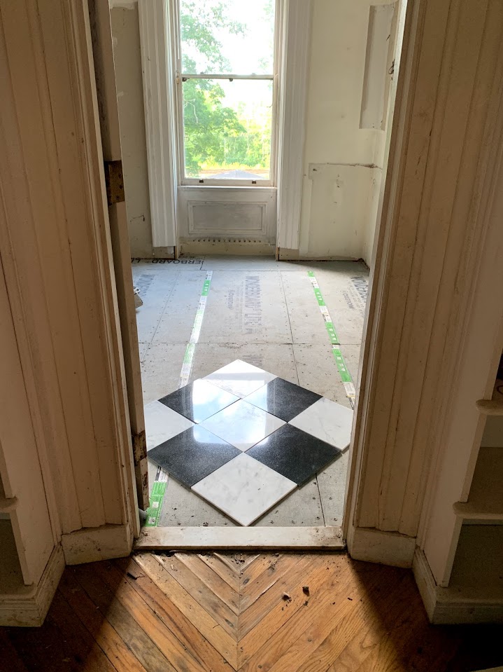 Then, they started laying the tile. I was definitely inspired by Gwen, The Makerista’s, kitchen floor in a timeless black and white checkerboard pattern, and I used the same tile she did because it’s so inexpensive for beautiful natural marble and granite.
