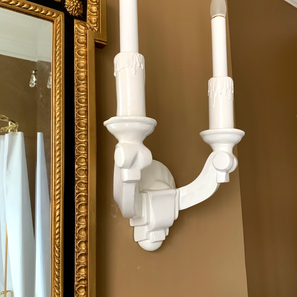We installed these sconces that I had found on Ebay earlier in the year – they arrived broken but I was able to glue them and paint the cracks. I loved the large scale because it felt dramatic while the white on white plaster cast look felt elegant.