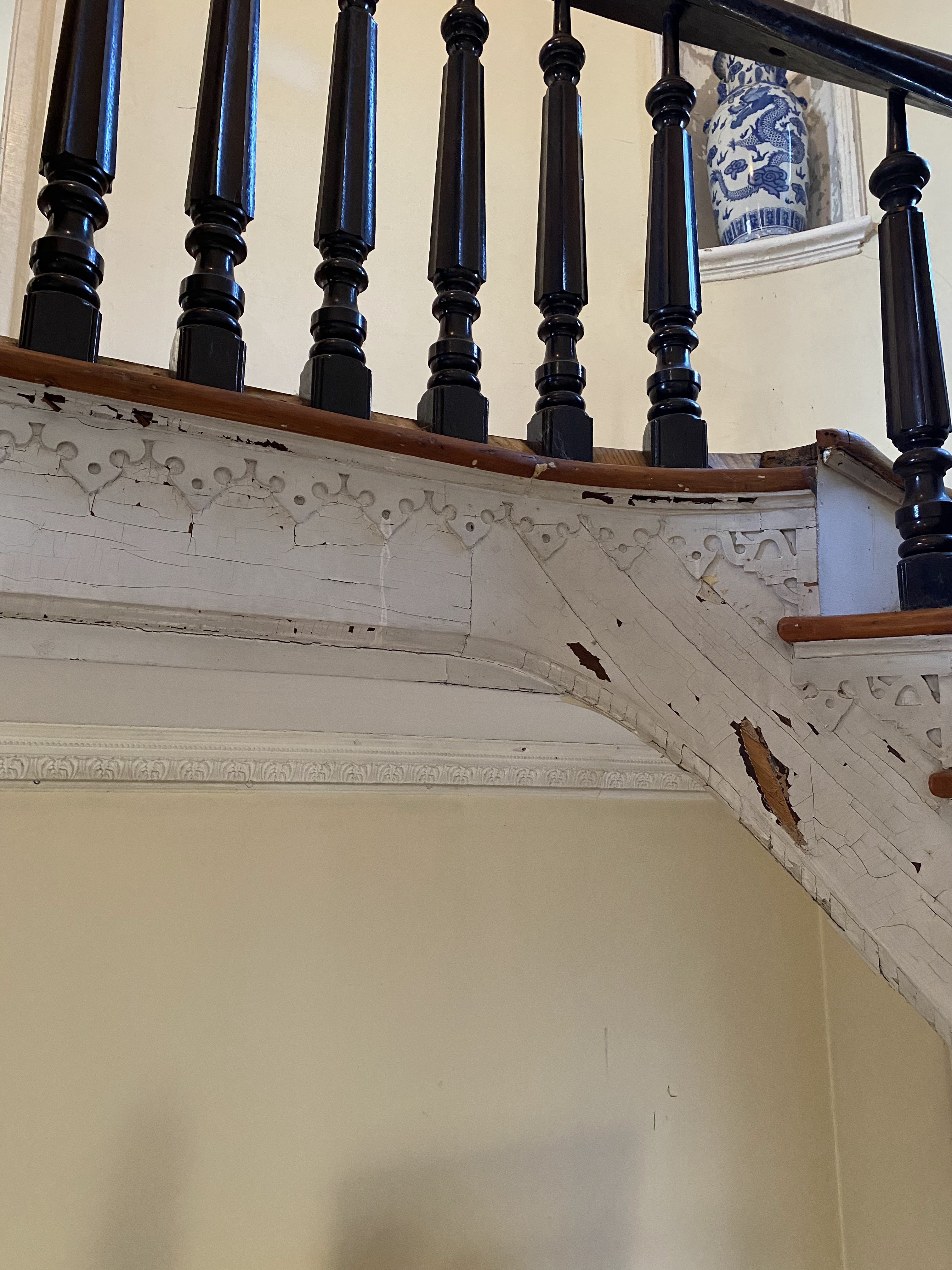 Here is a photo of the staircase where you can see the little pointed arches I copied for the shelves.