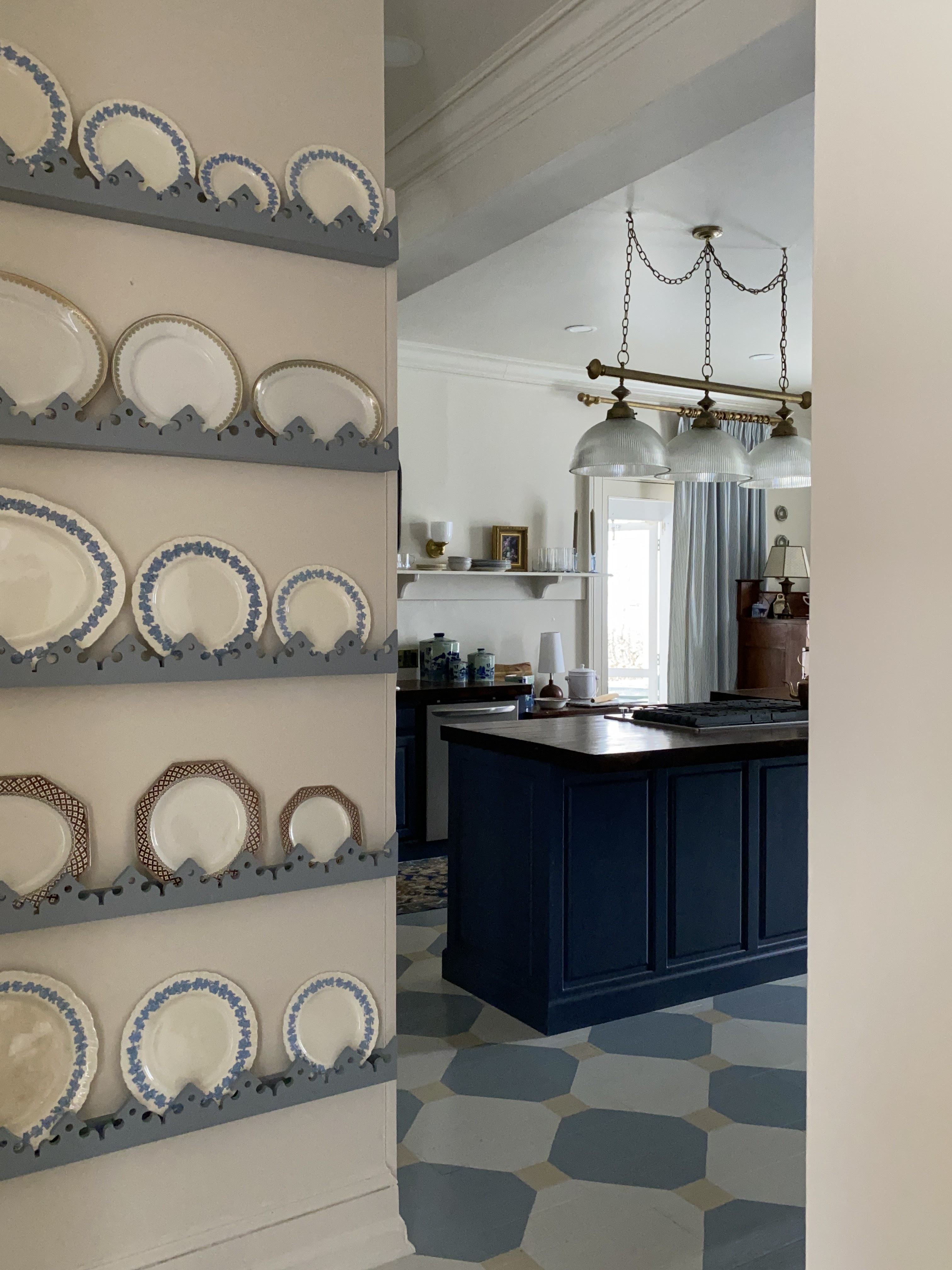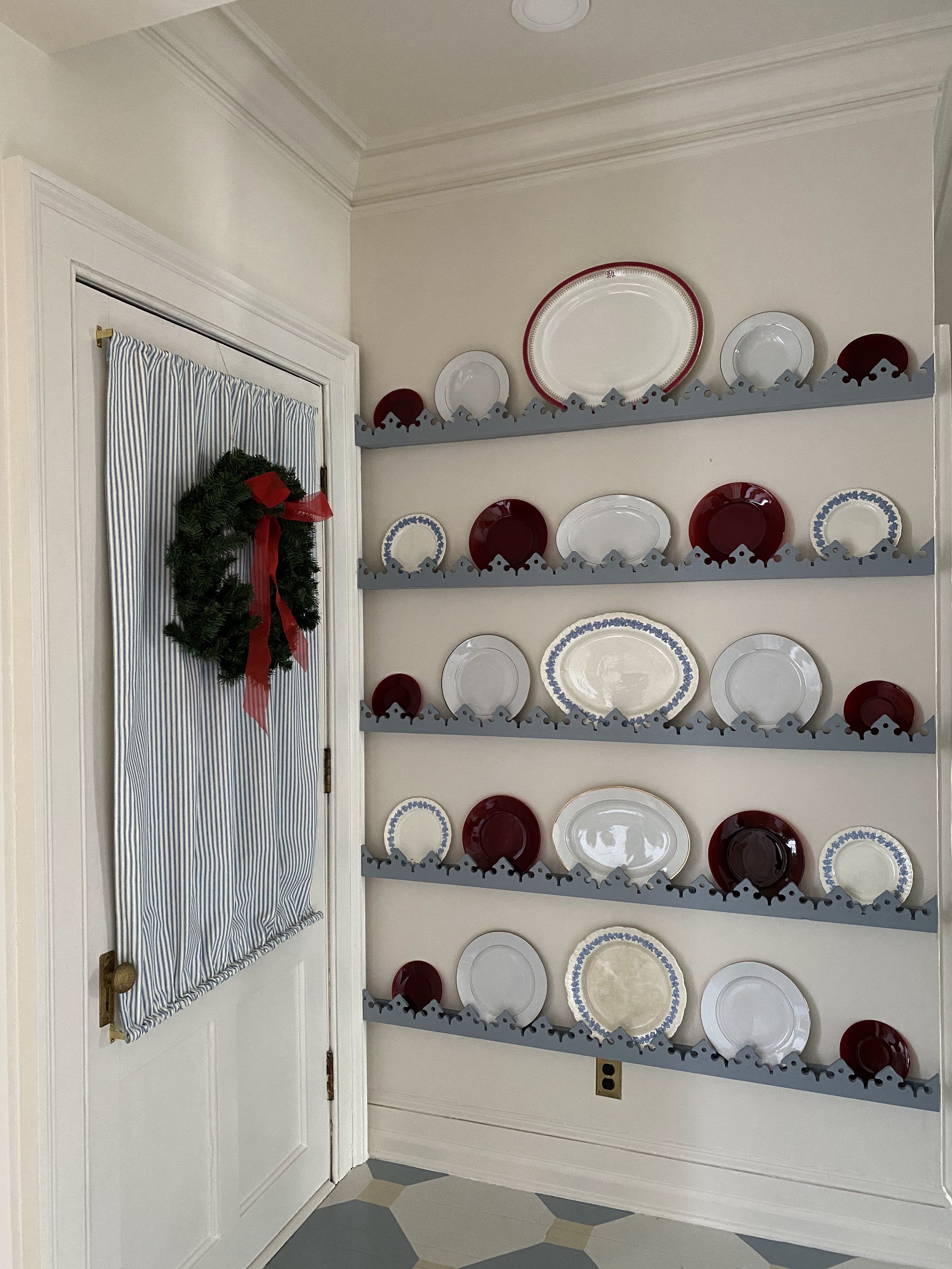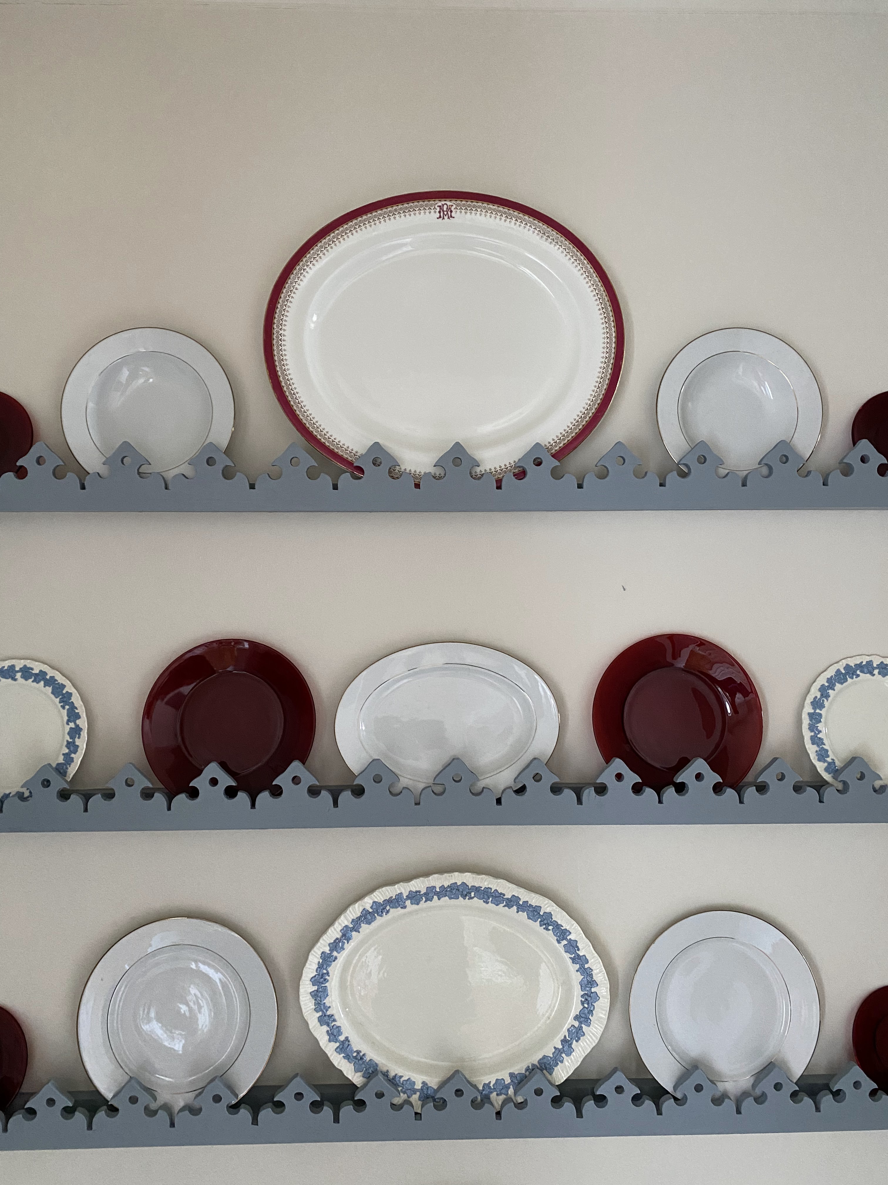 One of my favorite details of our kitchen renovation was the full wall of plate racks we built at the entrance to the room. I love design that is simultaneously functional and beautiful and I love displaying collections in impactful ways. I had both of these ideas in mind when I thought about creating this display. I also loved the idea of making it look handmade and kind of quirky. Whenever I walk through an old house I love seeing the way that utilitarian items like cupboards, shelving, or closet systems, were given special details and flourishes — that’s the spirit I was trying to evoke with these plate racks. The pattern on the fronts came from the decorative details on our staircase, an idea that came to me one day after I was racking my brain for how to design the shelf fronts ( I considered scallops, shells, fleur de lis, and other classic shapes).