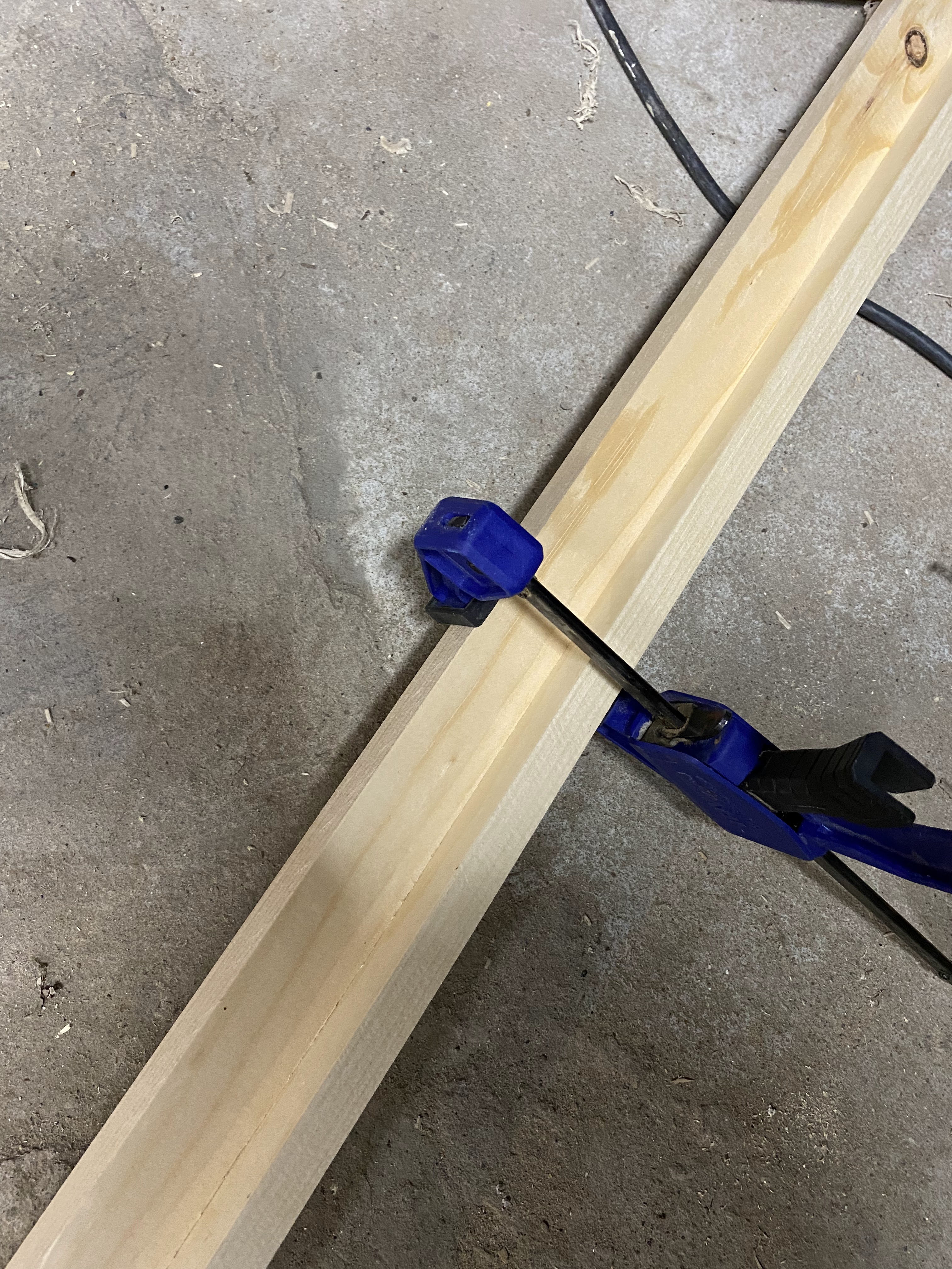 Next, I attached the back and bottom of the shelves together. First, I clamped the two boards in place so that they wouldn’t move.