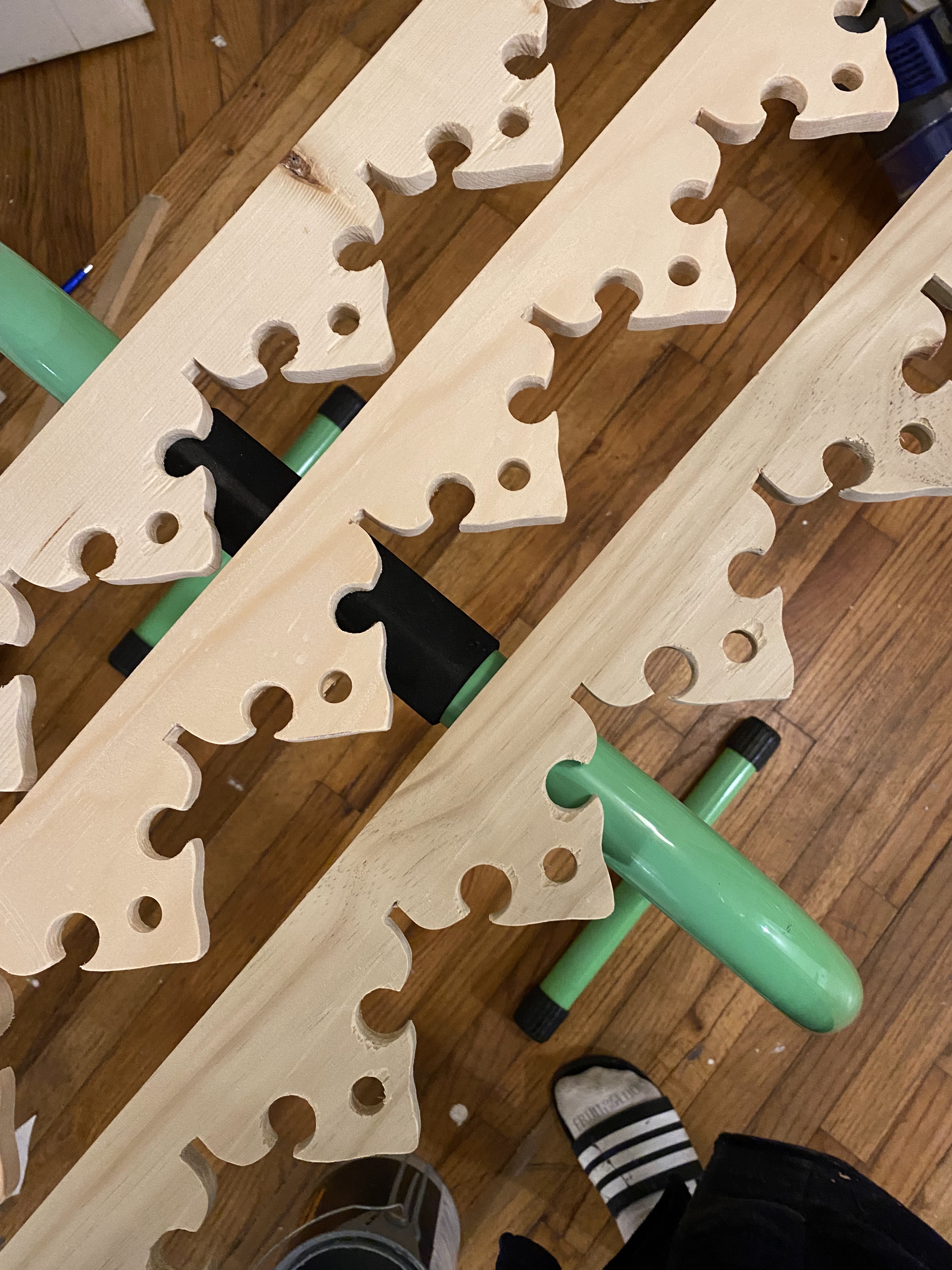 My brother, Joe, helped me come up with the structural design for the shelves. The back (that attaches to the wall) and the bottom are standard 1×2 pine and the front is a 1×4 planed down to 1/2 inch thick and then the pattern is cut out of that.