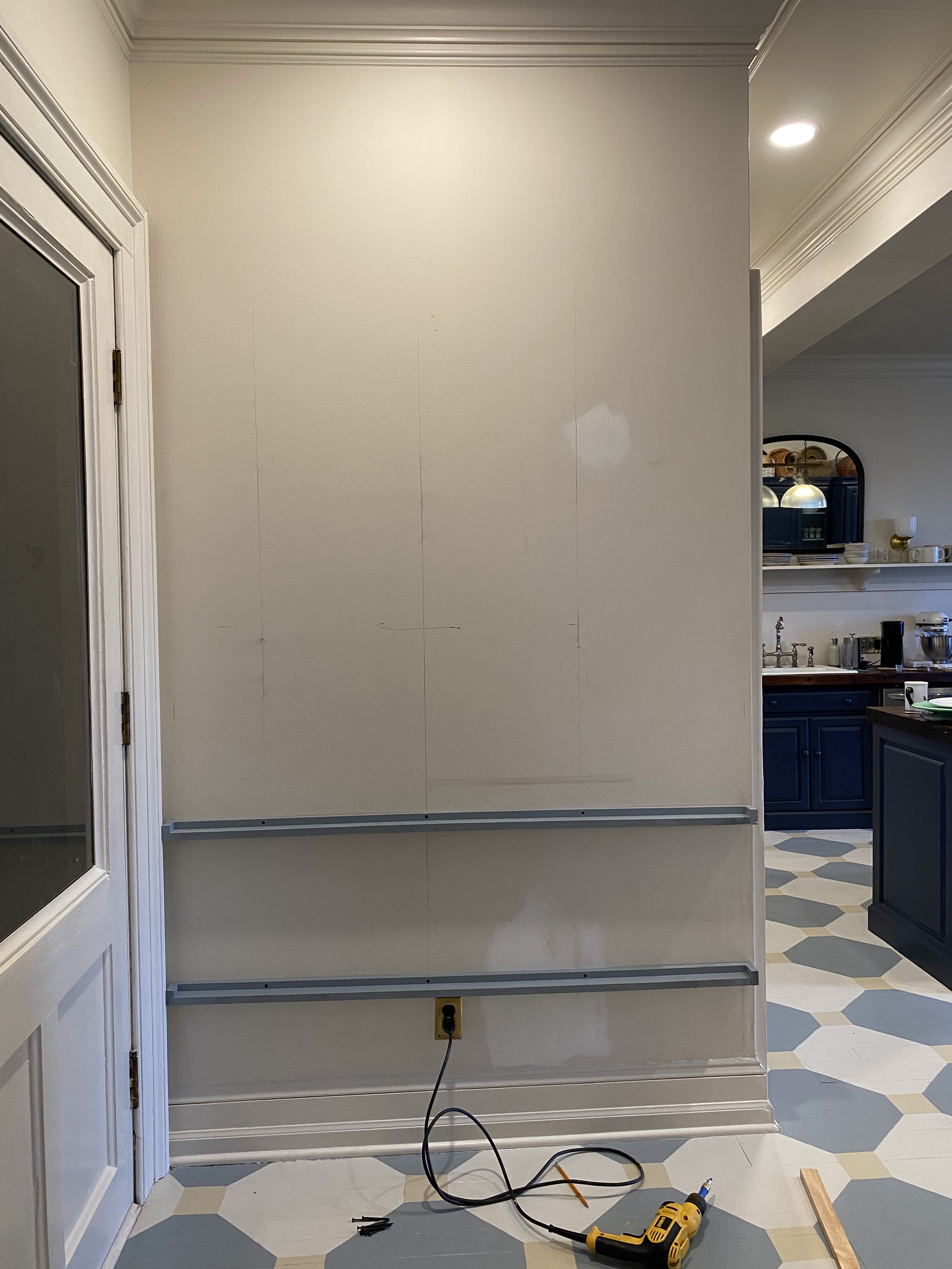 To hang the partial shelves (still missing the shelf fronts), I found the studs on the wall where the shelves would be attached and marked plumb lines along the studs, which you can see below.