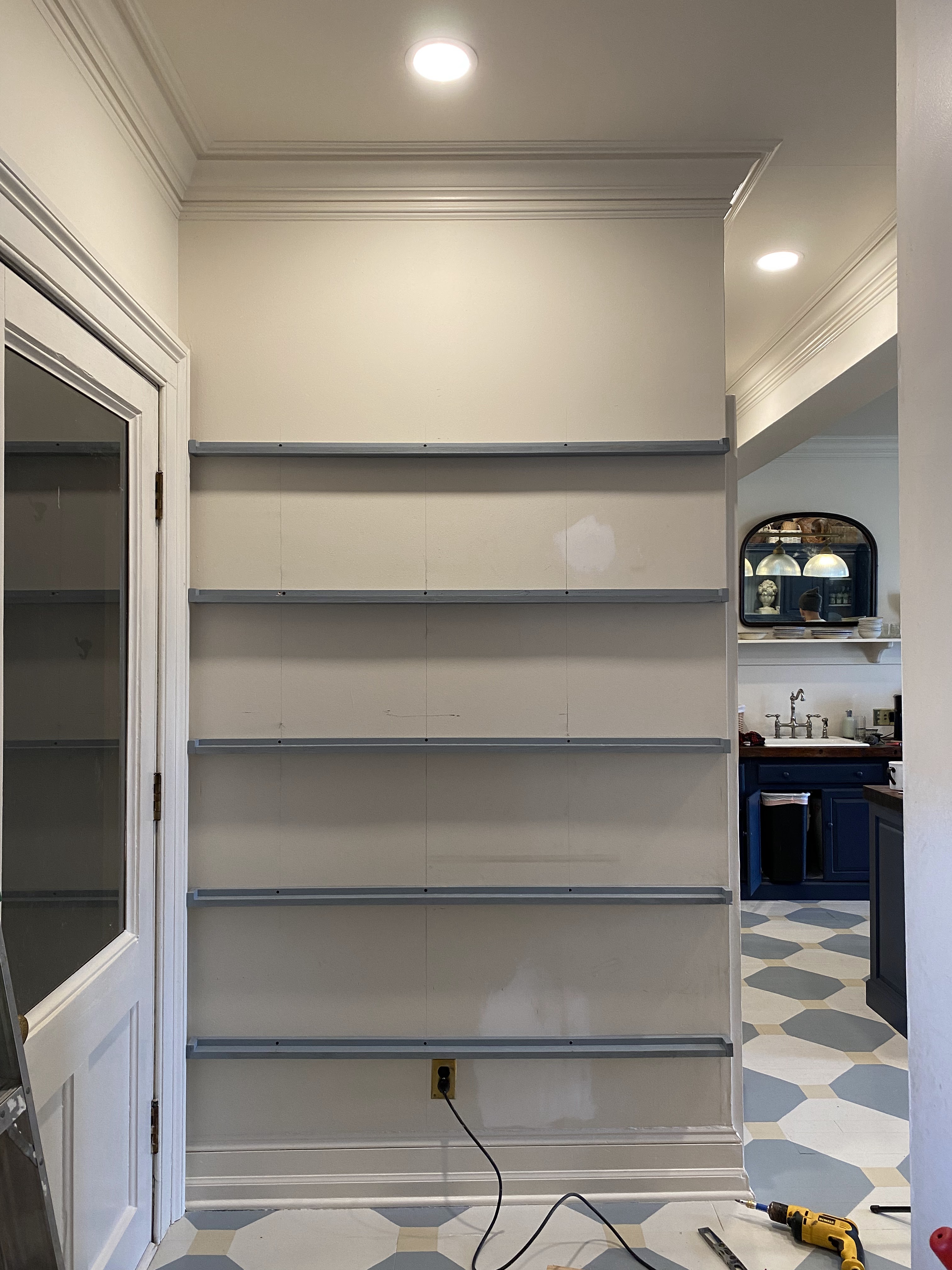 Next, I added the little shelf sides, made from a piece of 1×2 cut just big enough to sit flush with the top of the back piece and the front of the bottom piece. I didn’t take a photo of these, but you can see them in the subsequent photos. I attached those with a finish nailer. Then, I filled the nail holes with wood filler, sanded when it was dry, and primed and painted the shelves. The color I used was Solitude by Benjamin Moore – I just used the leftover Floor & Patio paint from the painted floors.
