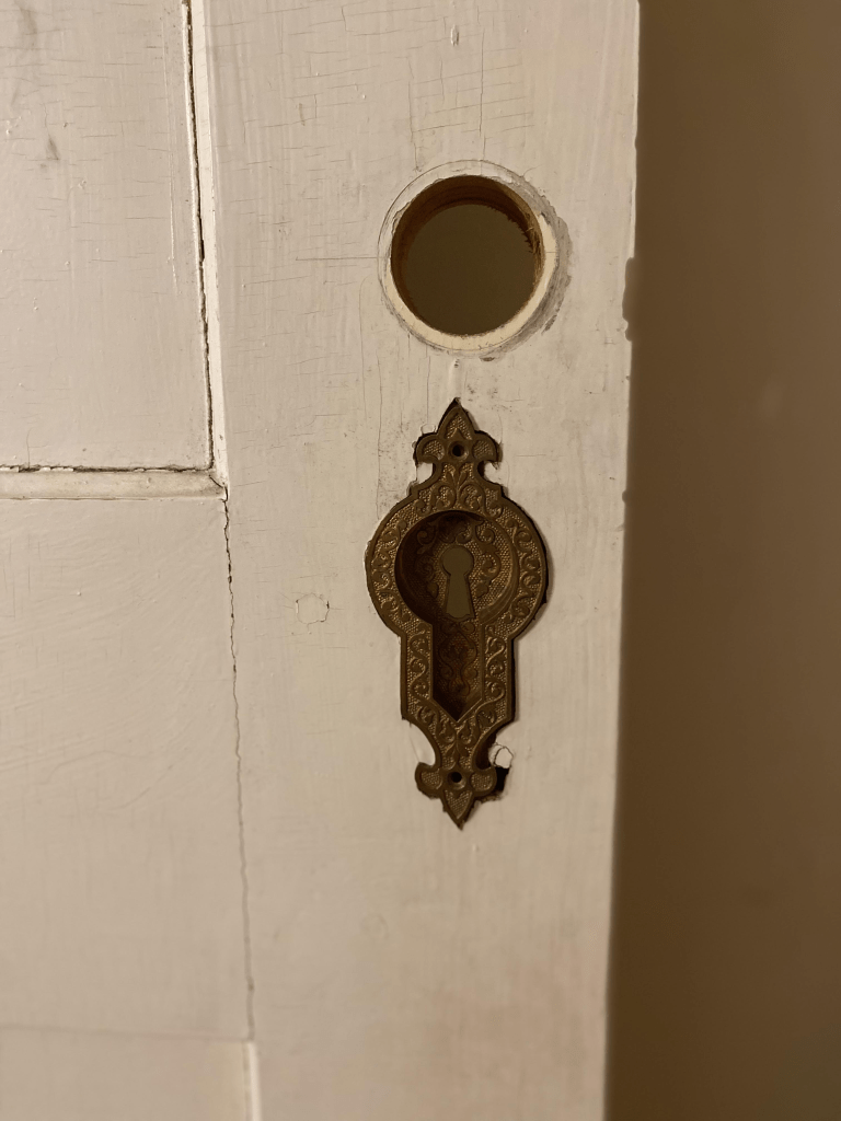 When we bought our house, much of the hardware had been stolen when it had been abandoned, but in old listing photos I had seen that our (overly large) closet doors had detailed, recessed hardware on them, and above that someone had drilled in to add traditional door handles. Well that recessed hardware was pocket door hardware! I ran upstairs to measure those closet doors and they were all the same exact size – they were the four original pocket doors!