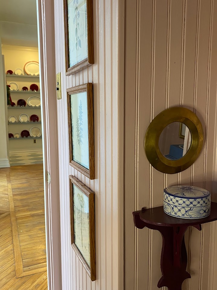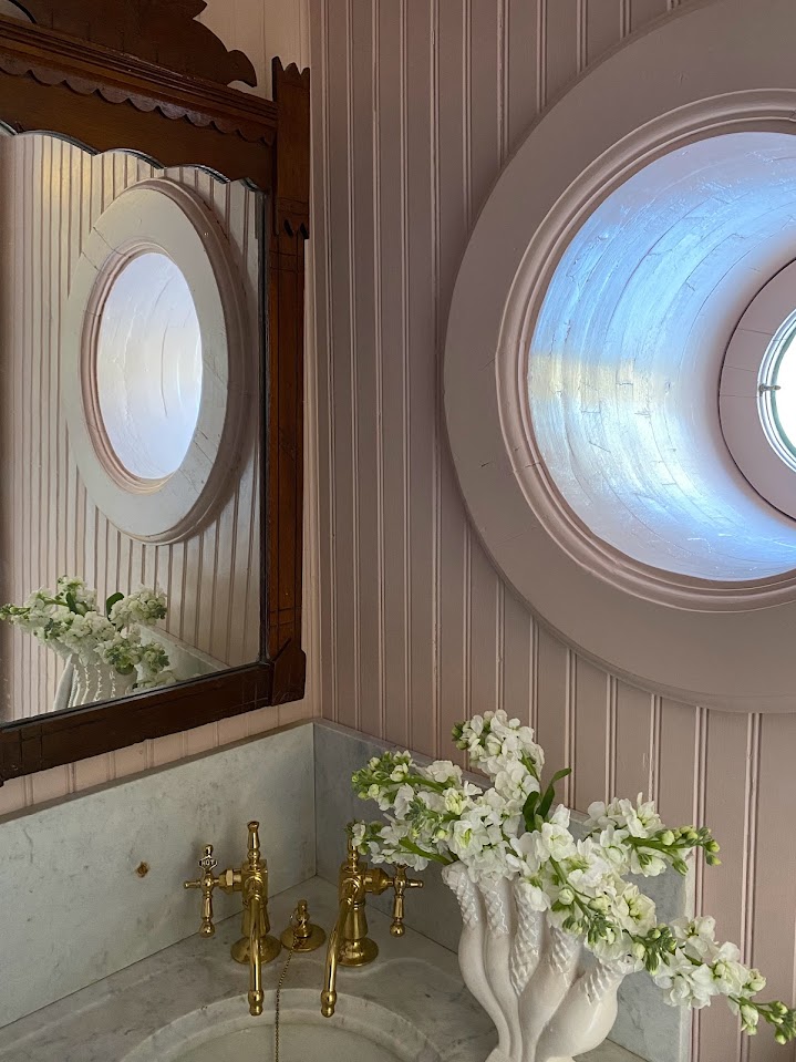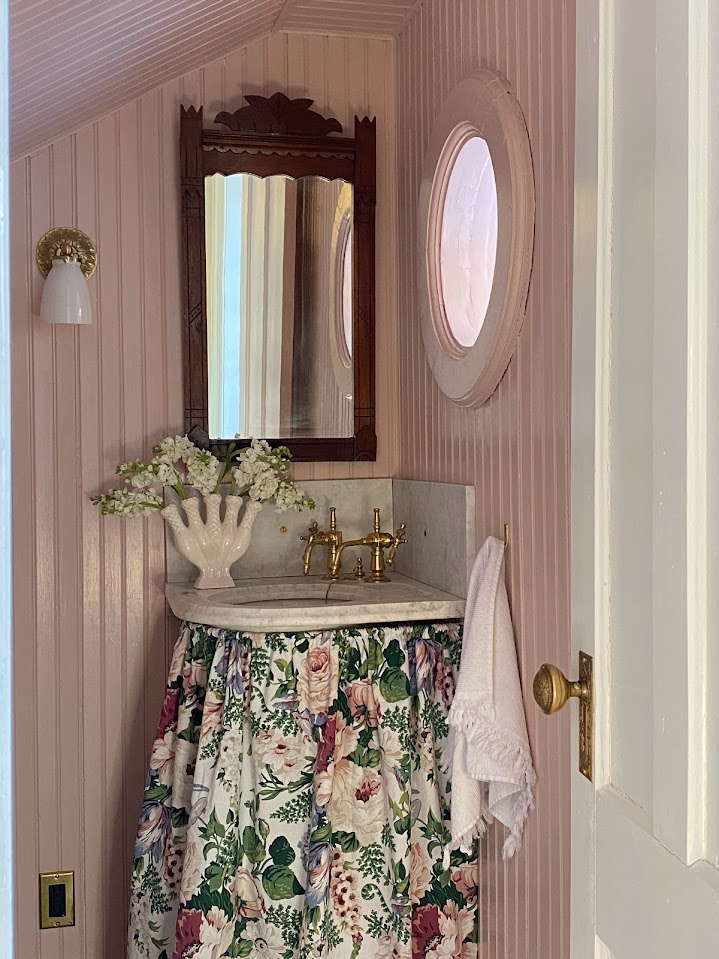Vintage: Marble Corner Sink, Wooden Mirror, Brass Mirror, Blue and White Ceramic Box, Burgundy Shelf, Tissue Box, Vase, Floral Sink Skirt, Botanical Prints