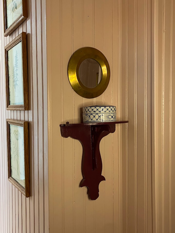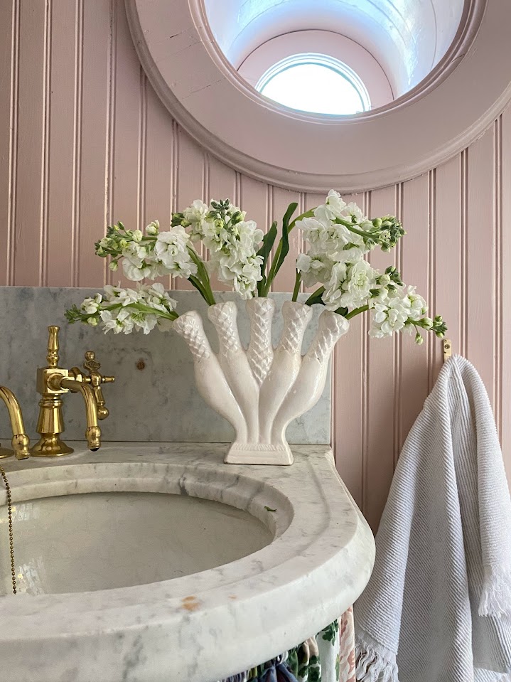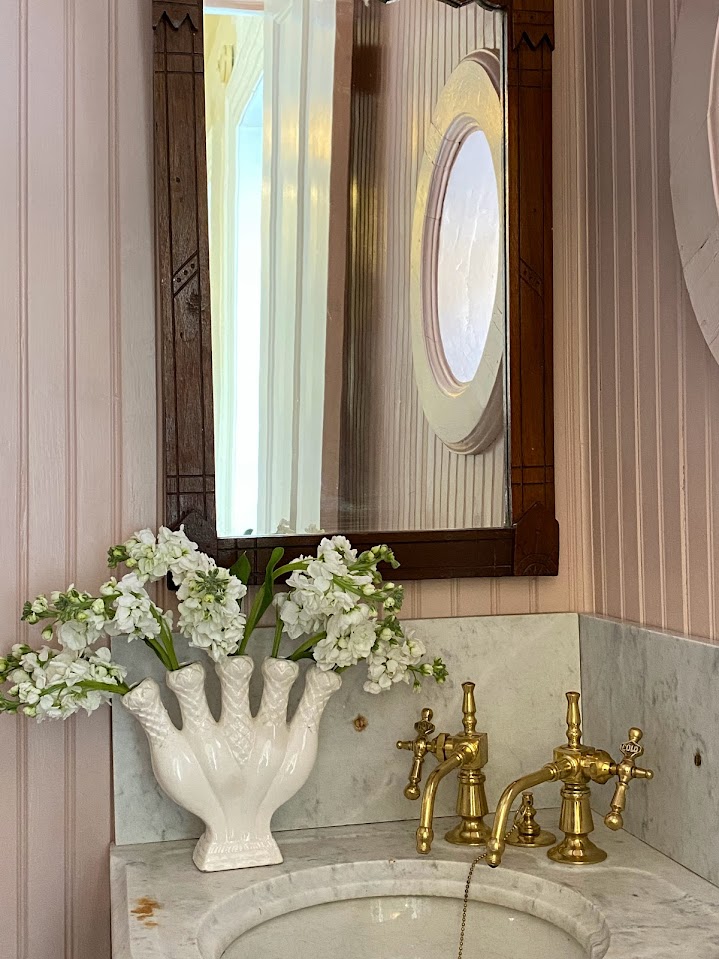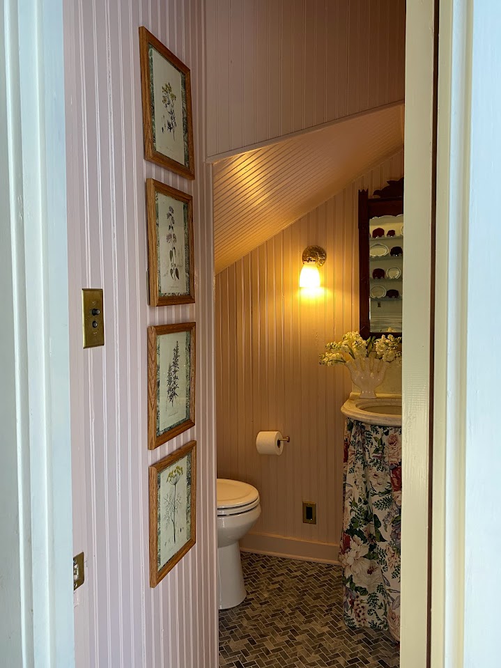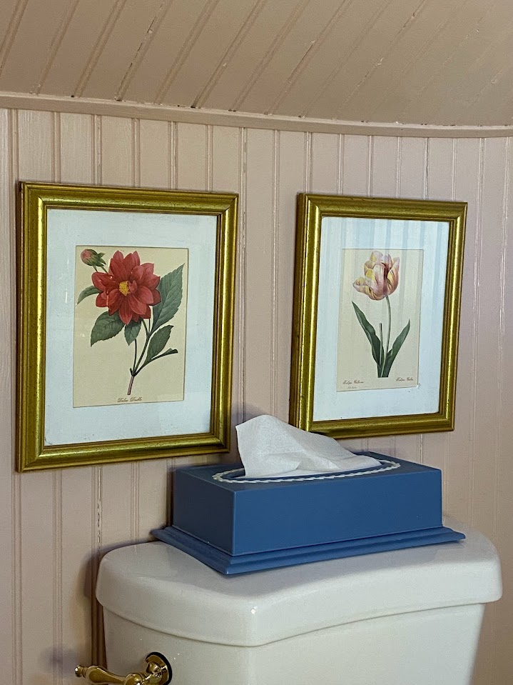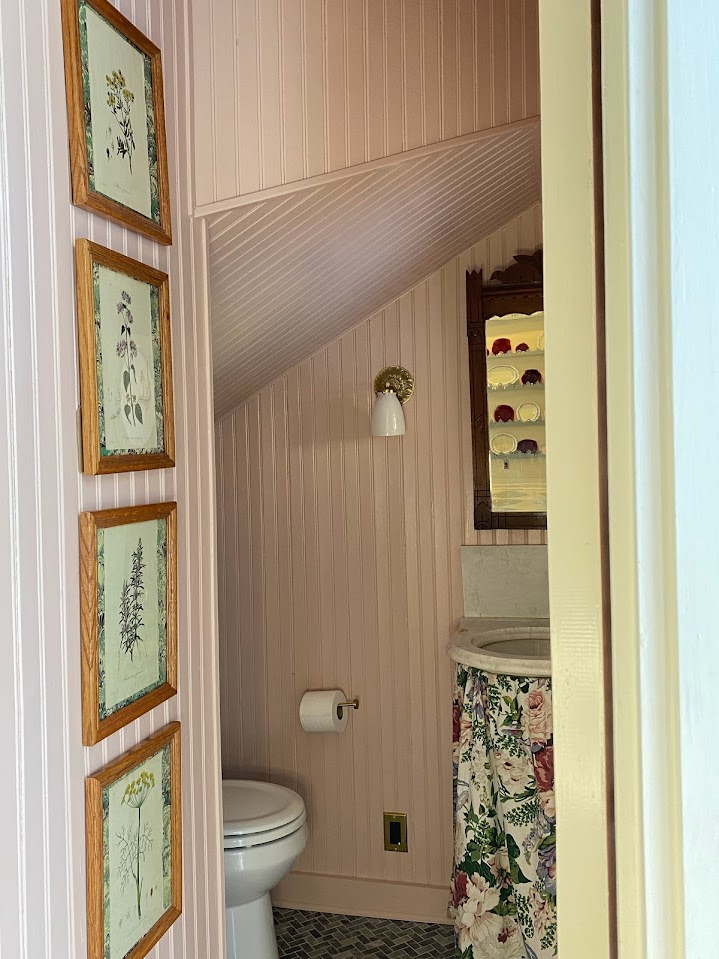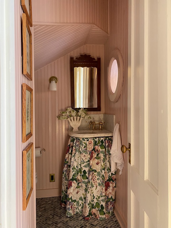 Vintage: Marble Corner Sink, Wooden Mirror, Brass Mirror, Blue and White Ceramic Box, Burgundy Shelf, Tissue Box, Vase, Floral Sink Skirt, Botanical Prints