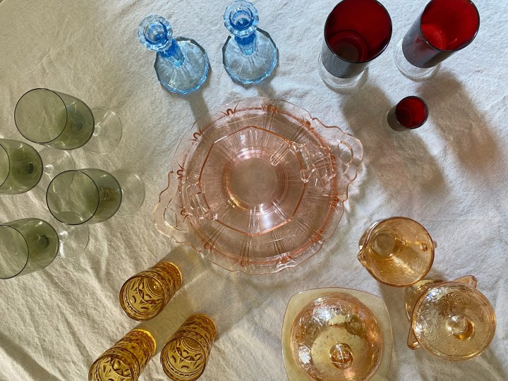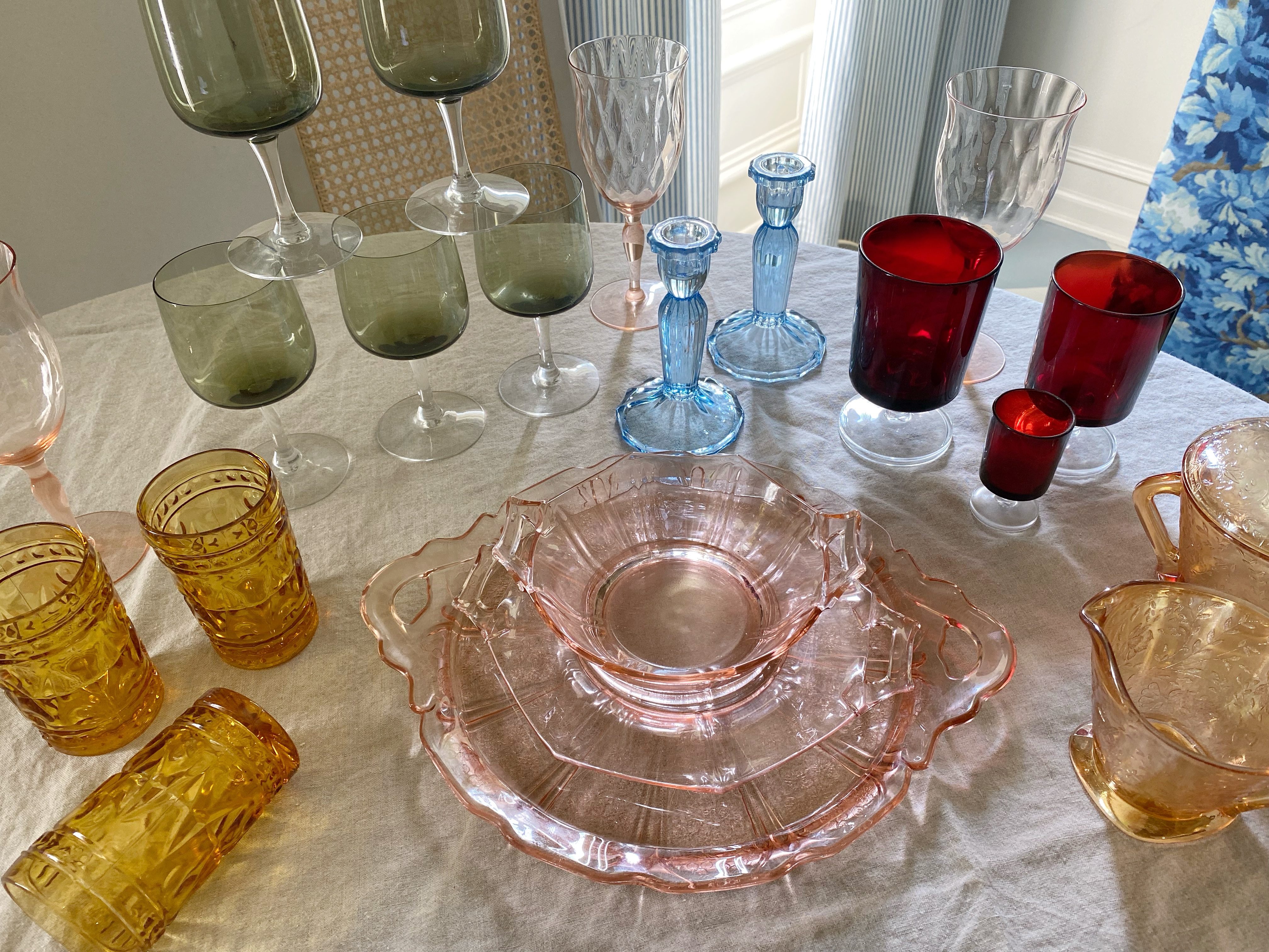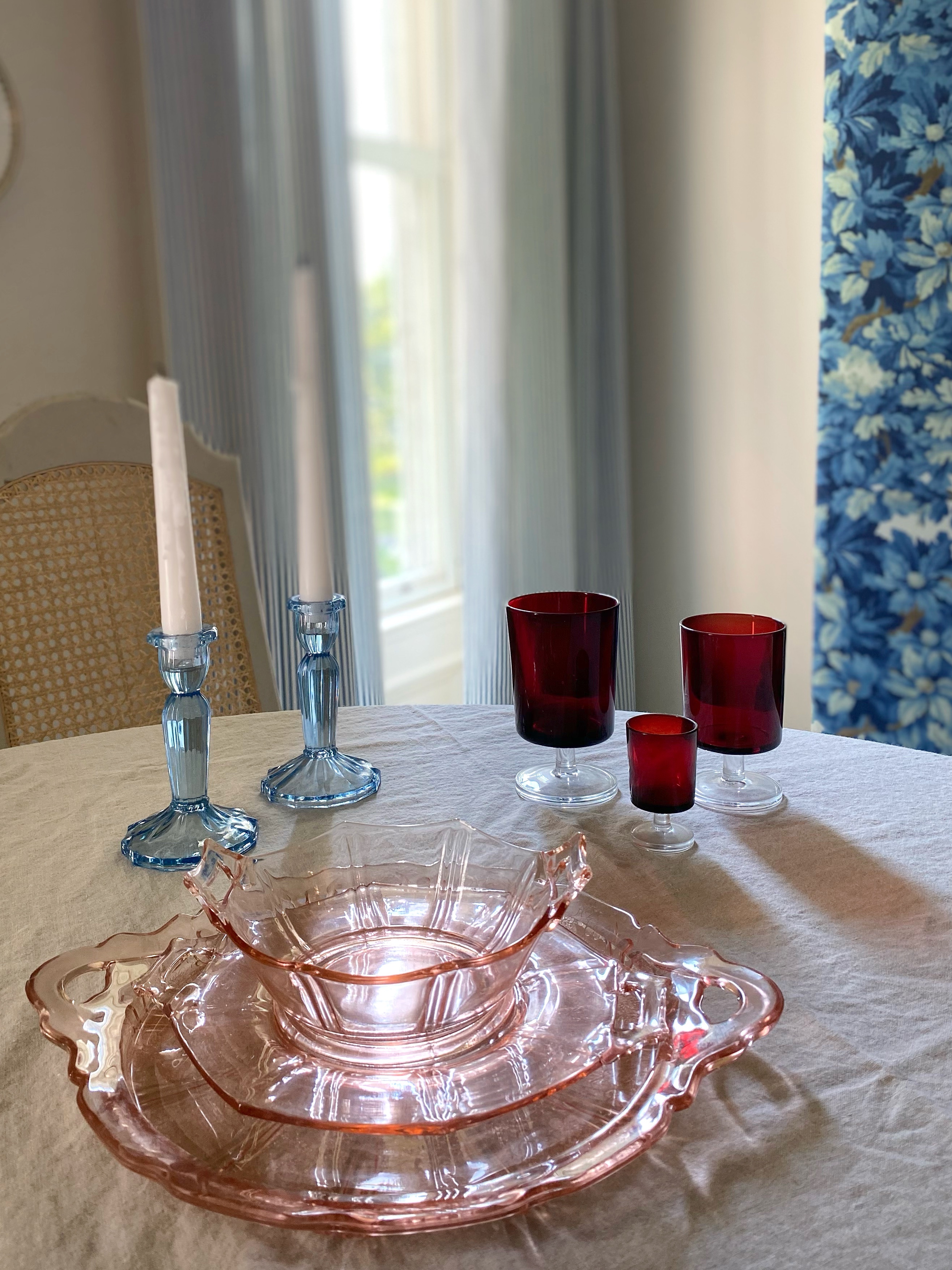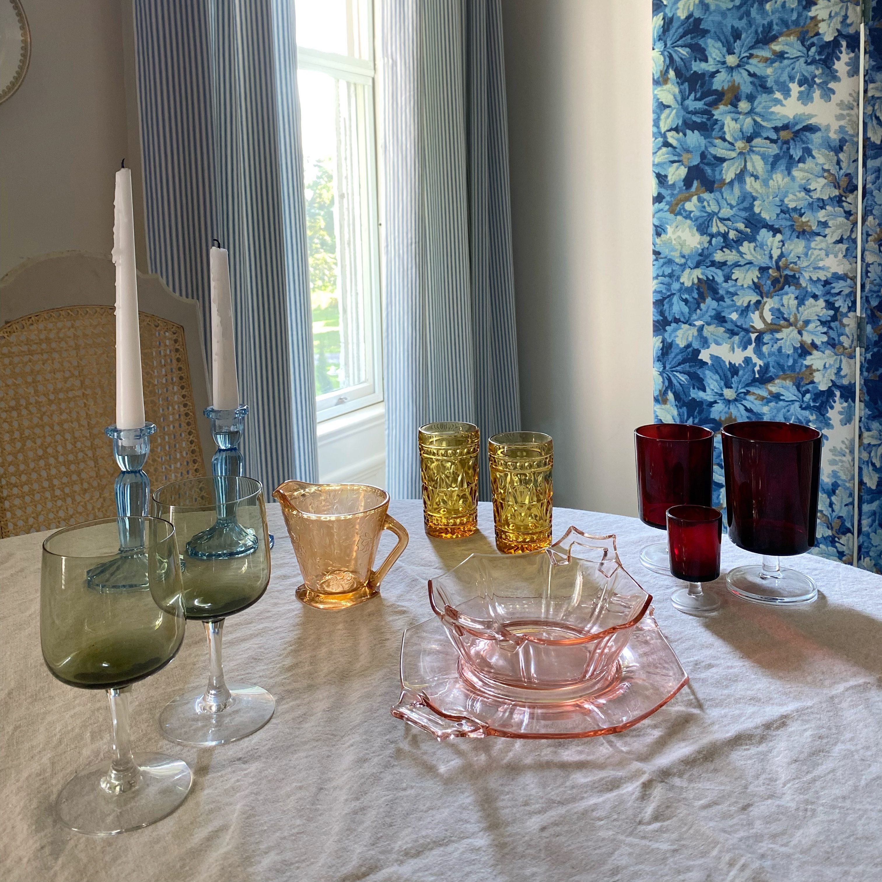 Most of you know I love thrifting dishes and serveware for entertaining, and in the past couple years I’ve been more drawn to crystal and glassware than ever before — it feels light and fresh and adds transparency and sparkle to more traditional rooms, which can sometimes be lacking. This summer, I’m especially loving colorful glassware — if I’m faced with drinking my champagne out of a clear glass flute or a pale pink depressionware glass you know which one I’m going to pick every time. The richer hues like cobalt and cranberry look like sparkling jewels on an outdoor table in the evening. The pale hues add a lightness and casual feel to simple summer meals.