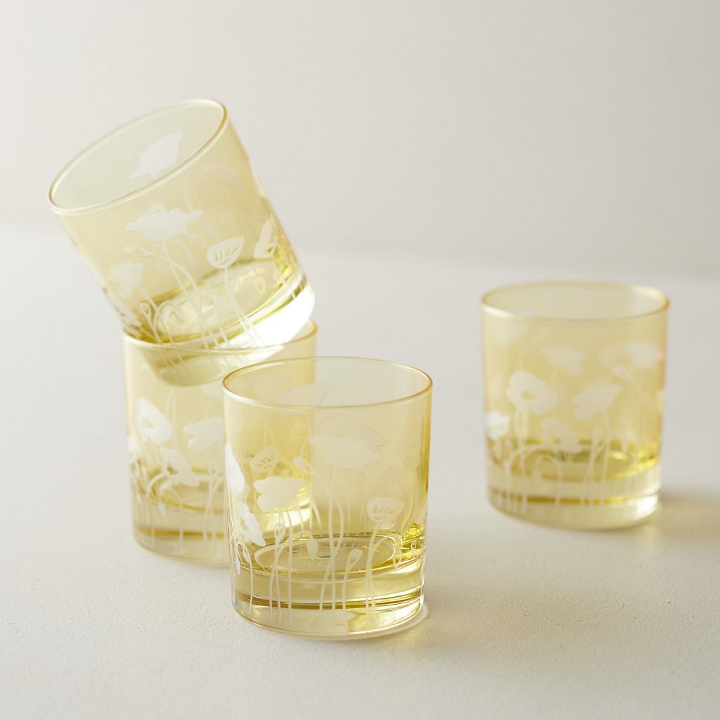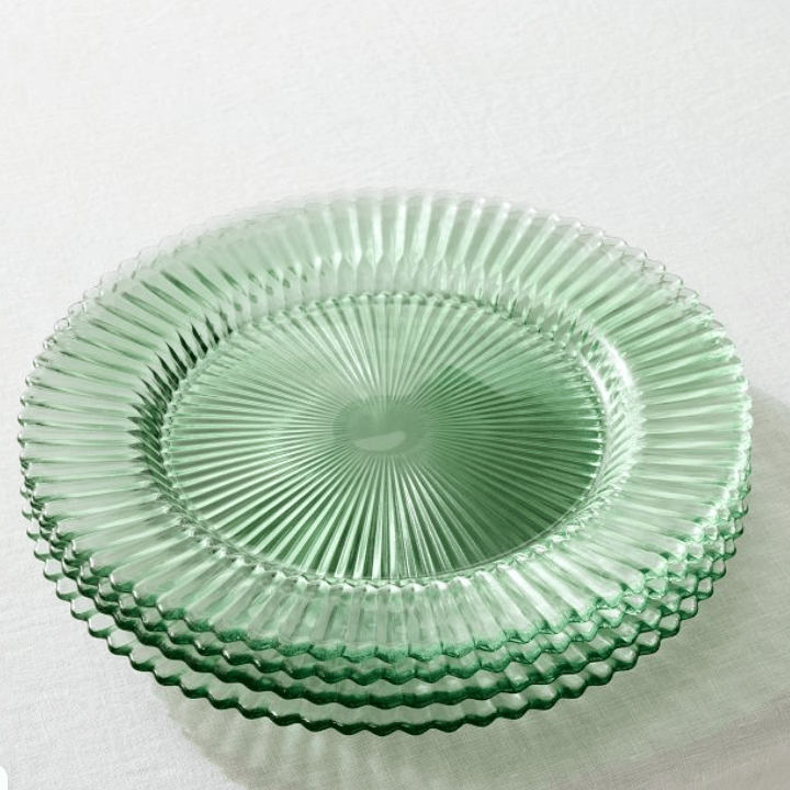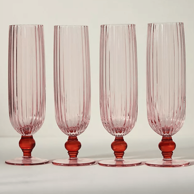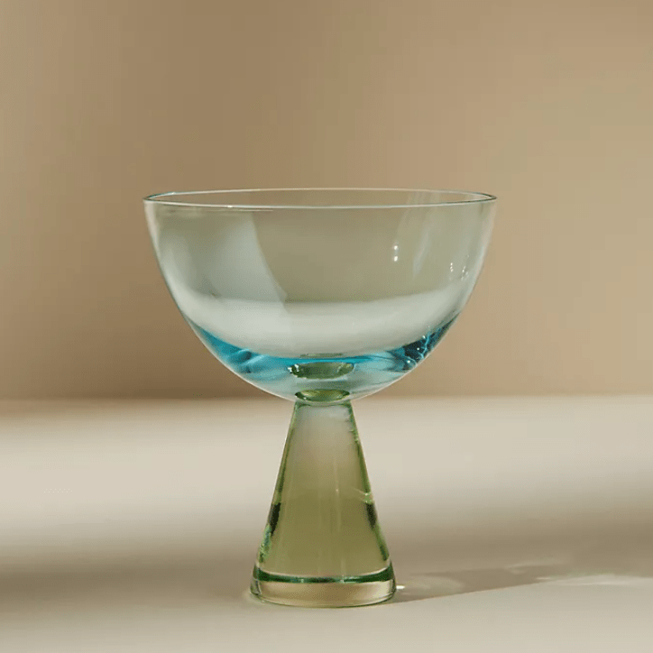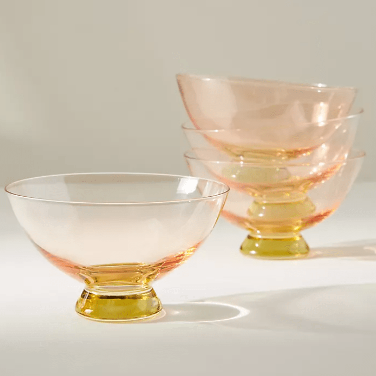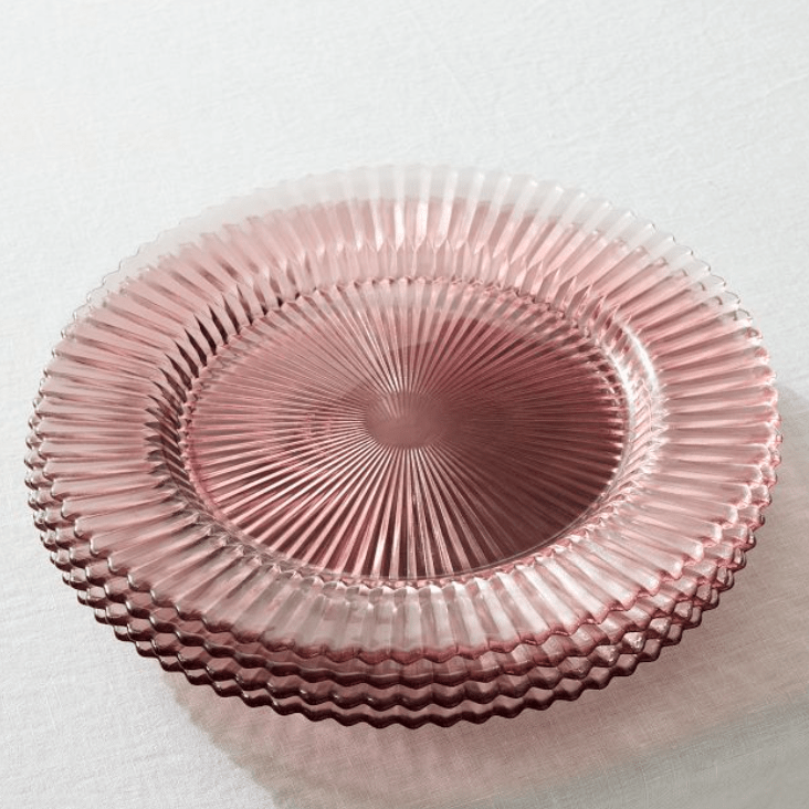 Most of you know I love thrifting dishes and serveware for entertaining, and in the past couple years I’ve been more drawn to crystal and glassware than ever before — it feels light and fresh and adds transparency and sparkle to more traditional rooms, which can sometimes be lacking. This summer, I’m especially loving colorful glassware — if I’m faced with drinking my champagne out of a clear glass flute or a pale pink depressionware glass you know which one I’m going to pick every time. The richer hues like cobalt and cranberry look like sparkling jewels on an outdoor table in the evening. The pale hues add a lightness and casual feel to simple summer meals.