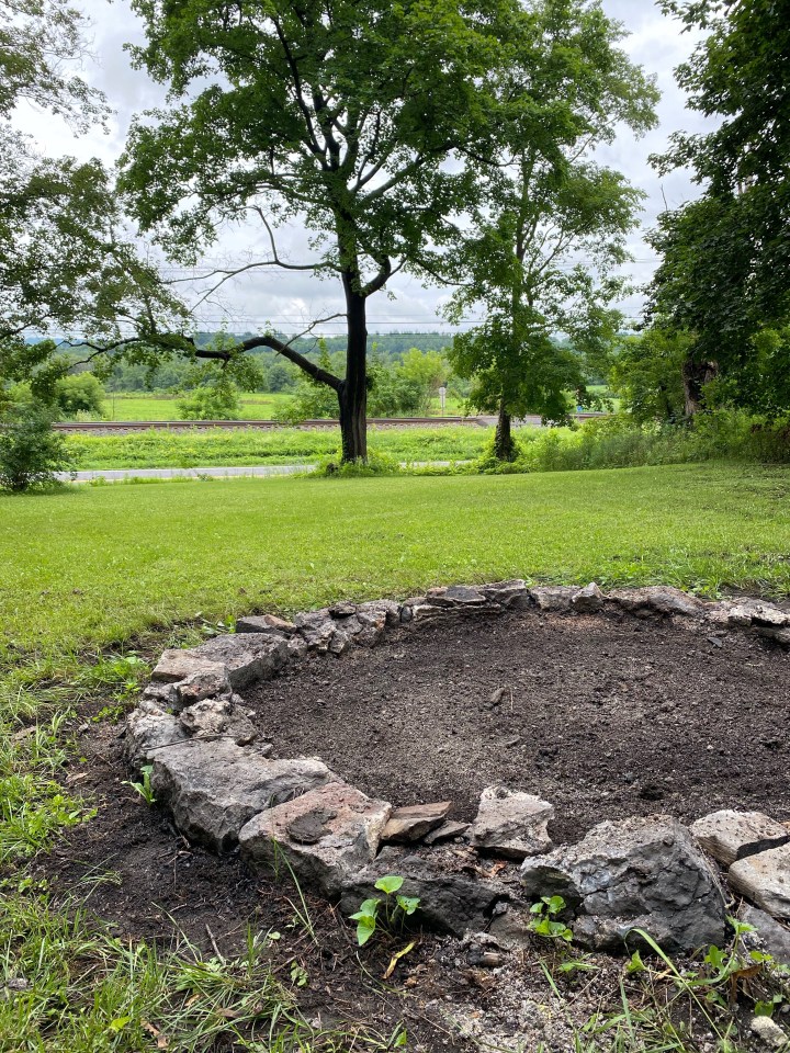 I assembled this extra-large fire pit from heavy rocks we found on the property when we first cleaned away the overgrowth. We have had fireside hangouts just a handful of times, and it’s probably because we don’t have designated chairs and have to lug them from the back of the house instead. Someday, I’d love to have Adirondack chairs here so we can make s’mores and enjoy the fire in the summer and fall, but until then, I think I’m going to bring a few extra chairs we have over there so that we use it more often. What I love about the space as it is now is the large size for larger bonfires or to keep the kids further away from our s’mores fires, and the ultra-simplistic design that blends in with the landscape.