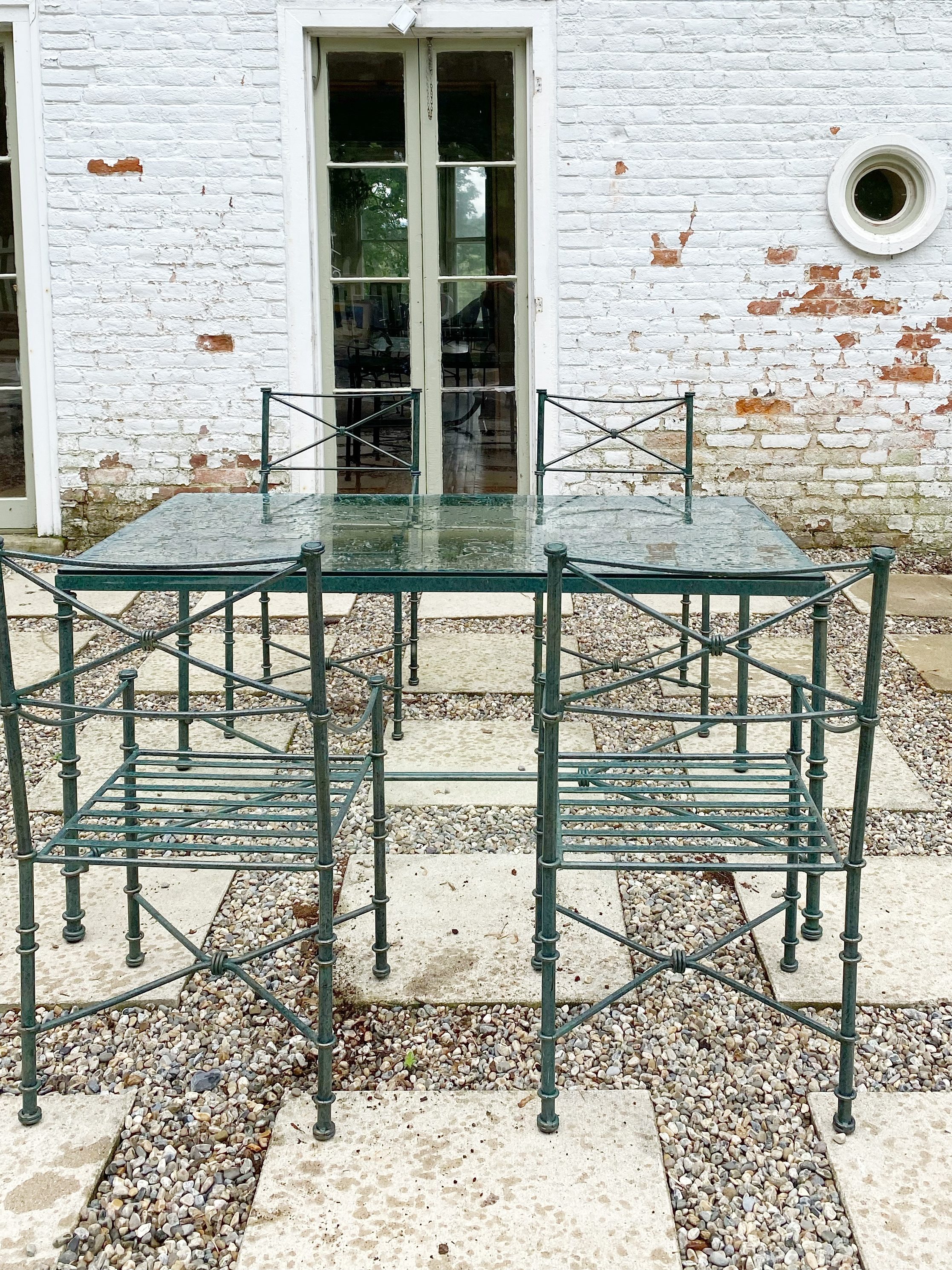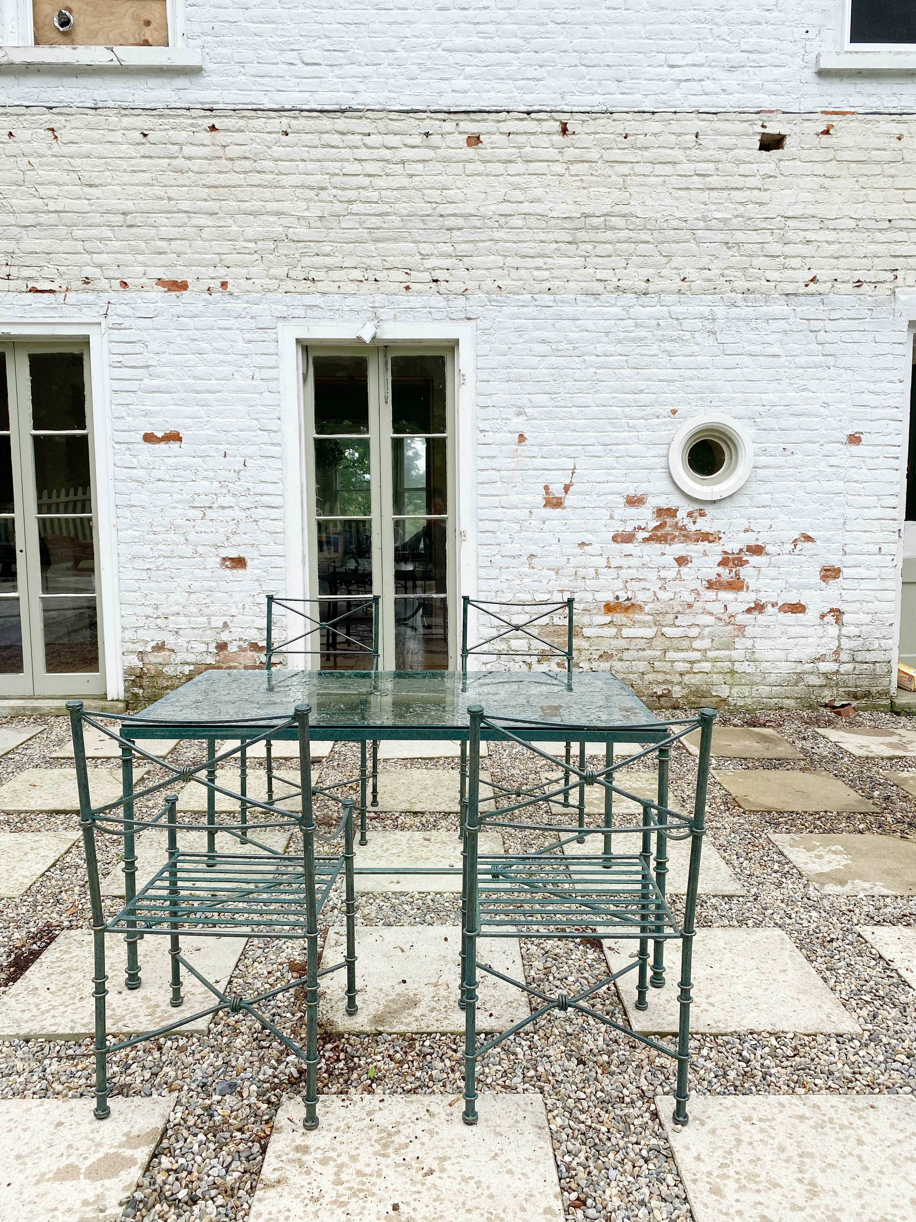 We have already set the foundation for our outdoor dining area, which will feature a long line of tables over the pea gravel and square paver patio we installed last year (would anyone want to see a blog post about that?). I just found this iron dining table set with 4 chairs, but I need another table in the same size to fill the space. I don’t mind if they are mismatched as long as they are the same height and width, and I have a few more iron chairs I need to makeover that can sit at this table as well. I’m also thinking that a pergola over that patio would be beautiful with some type of flowering vine growing up and over it. Since this area is directly off the dining room and adjacent to the kitchen, it just makes sense to have it be an extension of those areas for outdoor dining. Can you imagine it with those glass doors thrown wide open and sparkling string lights along the pergola? I placed two terracotta pots on the fence side of this space, which help define the space and make it feel decorated. Lanterns or potted plants on the tables, and more terracotta pots — maybe a plant stand against the brick wall — will fill this space in eventually. And obviously our ongoing project of restoring the brick will make a huge difference in this area as well.