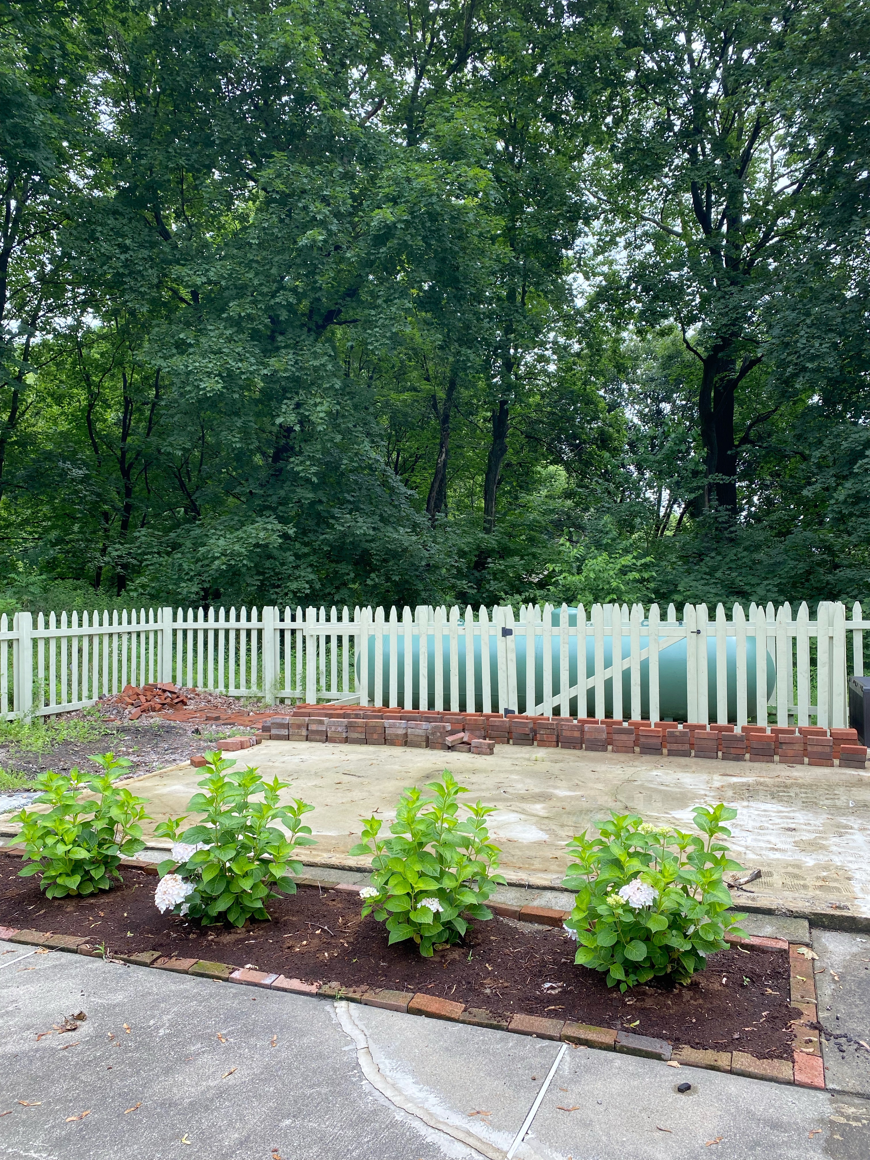 I was thinking that there would be a long counter directly behind the hydrangea bed, clad in brick and then limewashed the same creamy white color as the house (once I choose said color). Countertop material to be decided. Maybe it will have an L-shaped extension toward the propane enclosure on the right side, where we can place a few bar stools. In the countertop will be a grill, a pizza oven on top, and a mini refrigerator underneath — nothing extravagant — just enough to make preparing dinner outside easy. Behind the planting bed to the left, I was originally planning to continue the concrete slab, but Steve had the idea to level it out, fill it with pea gravel to call back to the dining area, and then build raised beds for herbs we can use for summer cooking. Wouldn’t that be really nice?