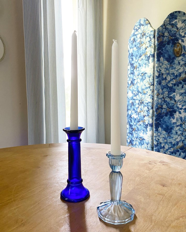 Every time we visit someplace new I love to visit a thrift store or antique shop or local art show — someplace where I can get a souvenir that will remind me of the trip whenever I see it. At Oneida Lake I found these cobalt blue candlesticks/vases that I love in our kitchen.