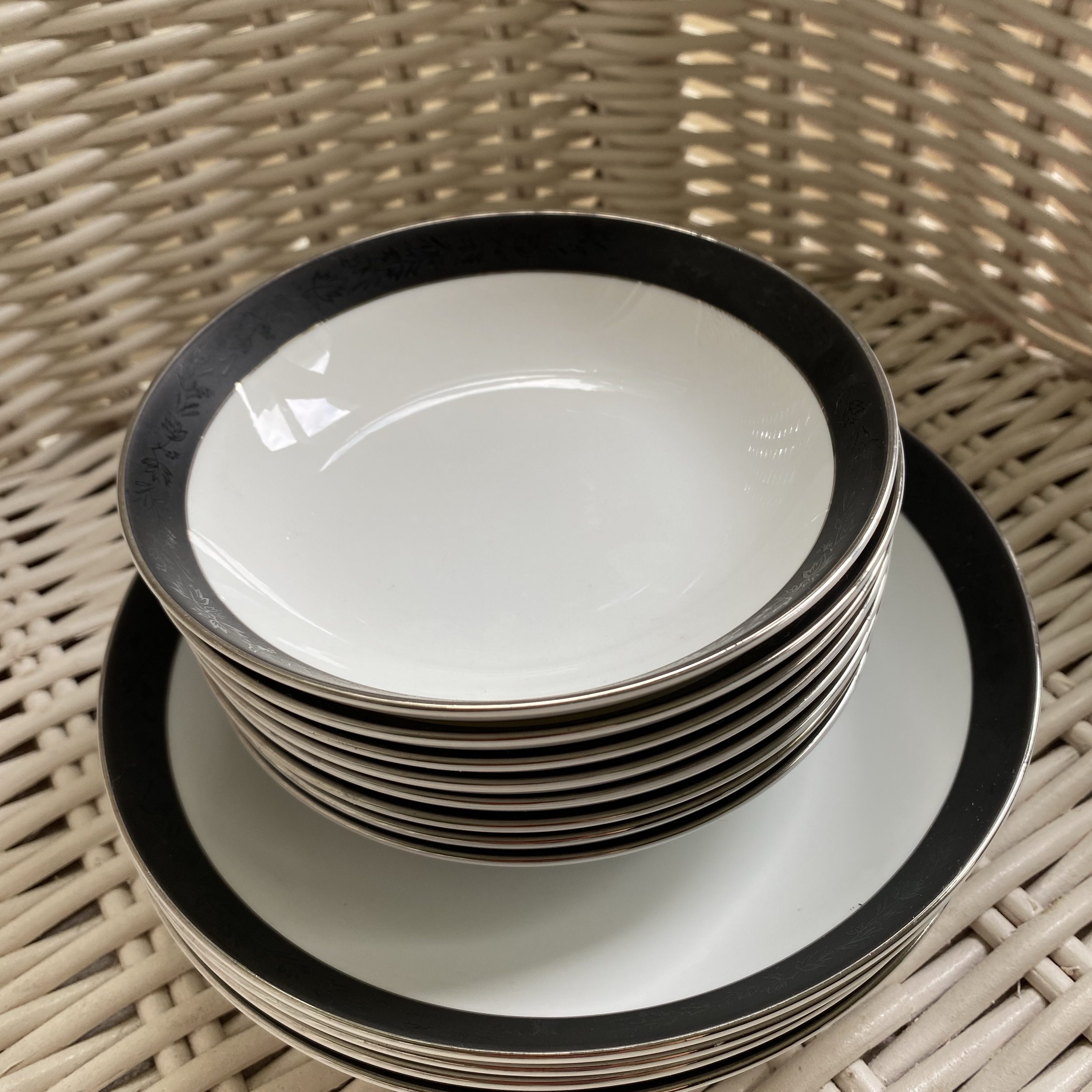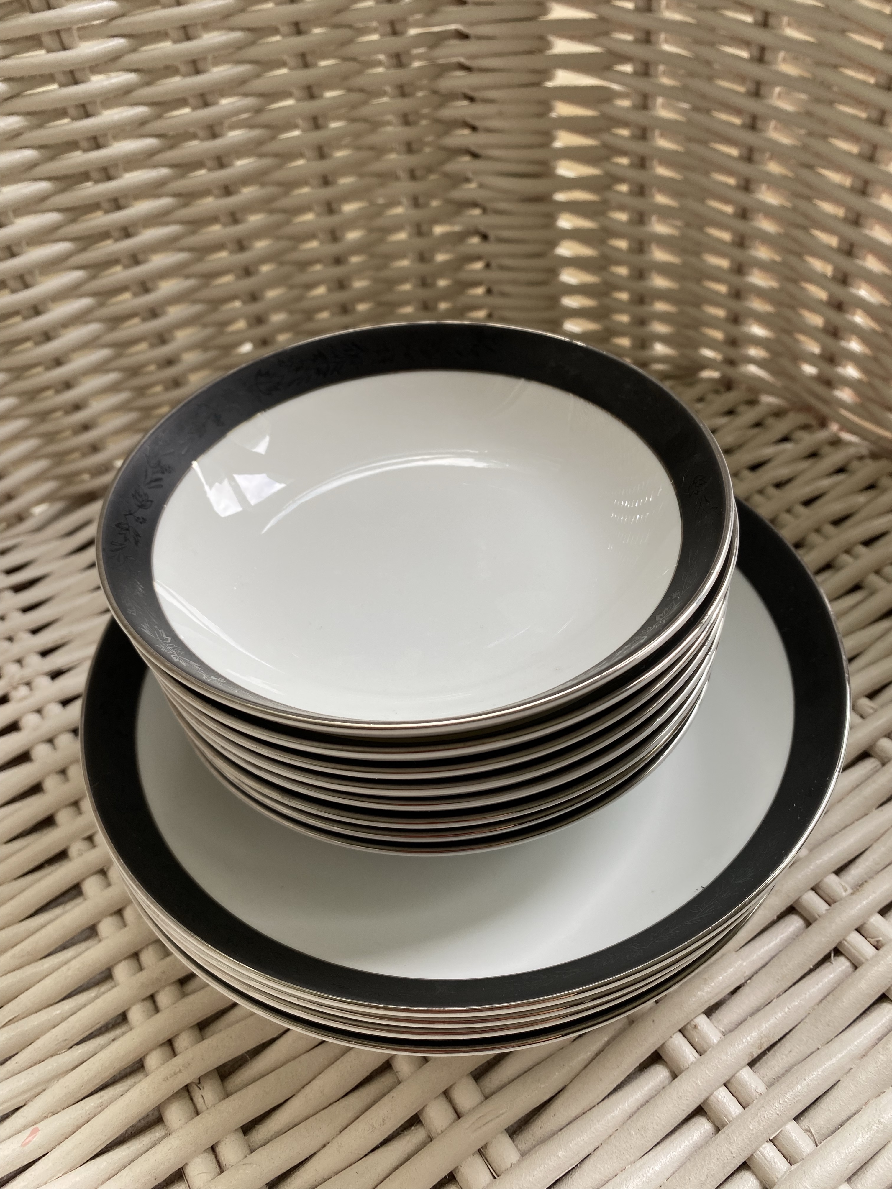 My kind friend Cait gifted this elegant set of black rim china to me that was her mother’s wedding china. Both her and her mother had decided they wouldn’t use it, and I was so happy to receive it — I feel like it’s the tuxedo of my china collection and I love the subtle embossed detail in the black rim.